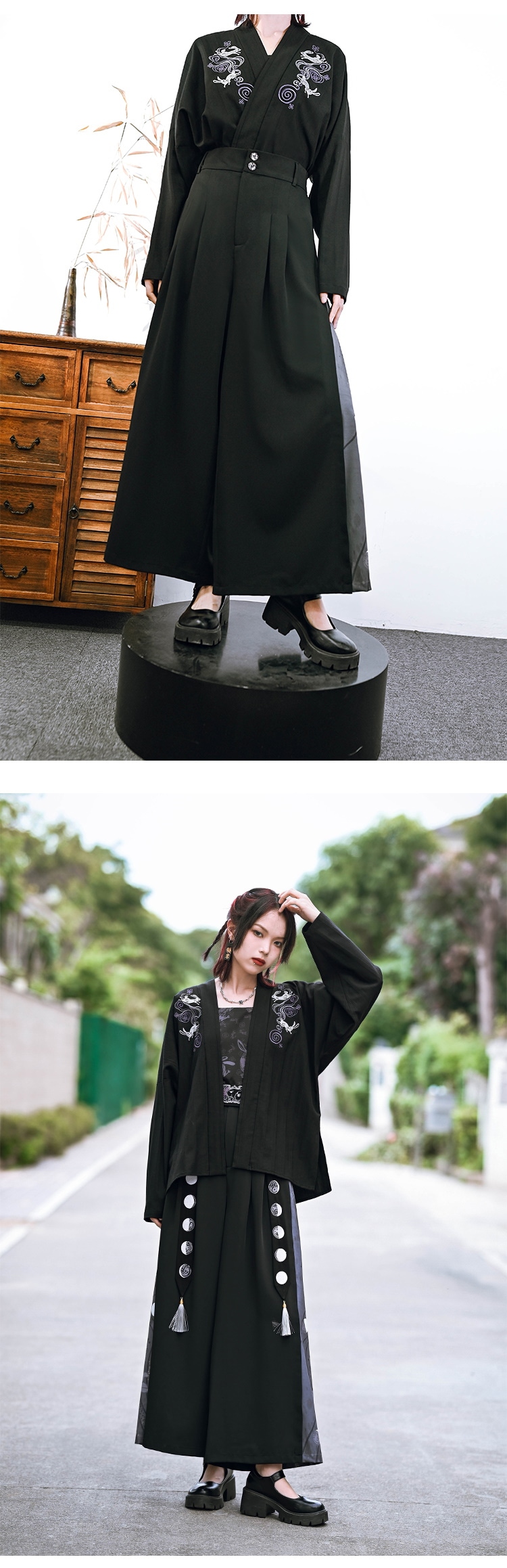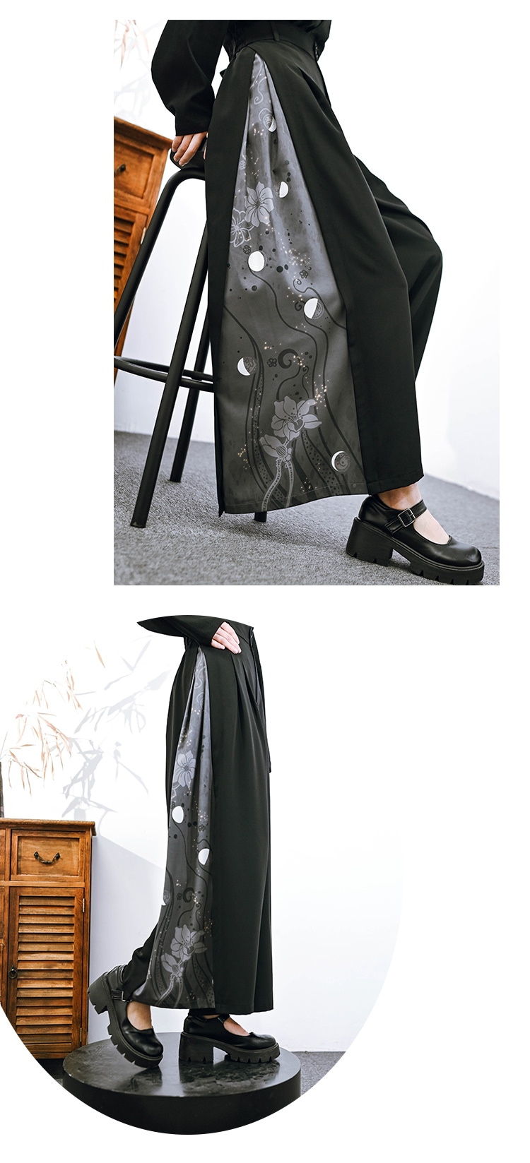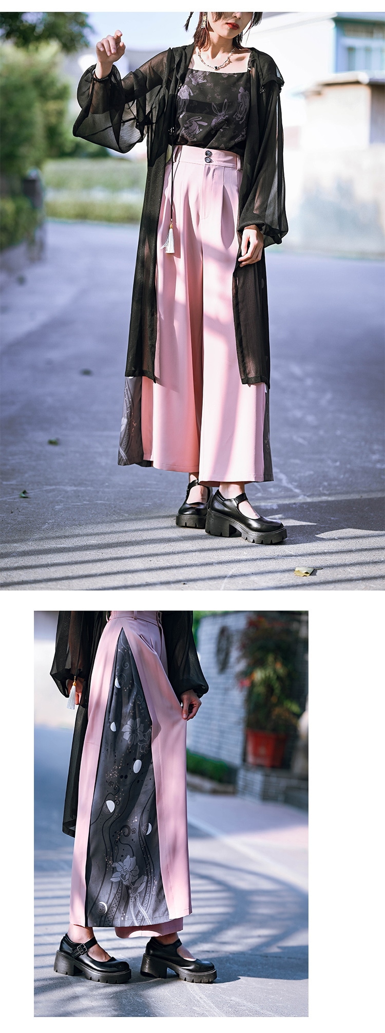 チャイナ風 ワイドパンツ レディース 柄パンツ 切り替え ボトムス ハイウエストズボン 黒 ピンク ロングパンツ