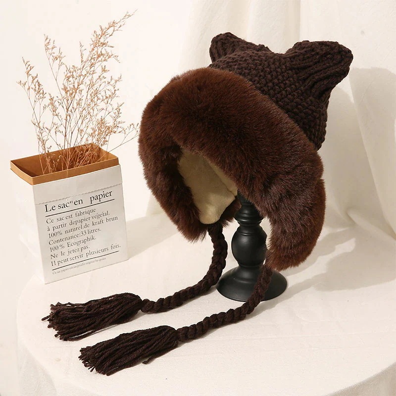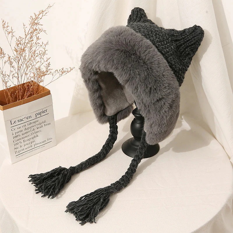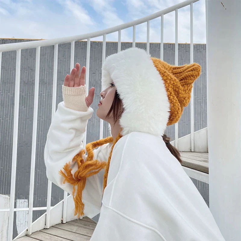耳ガードおさげのモコモコ優しい女の子可愛い 女優帽 クリスマス レディースファッション 冬 防寒 猫耳 ニット 韓国 秋 帽子 ニット帽 暖かい