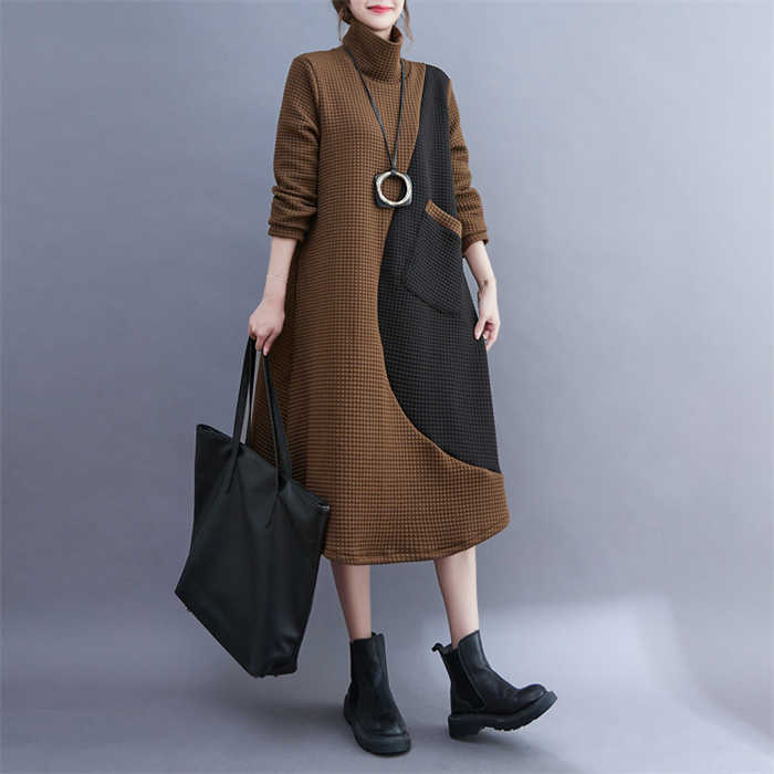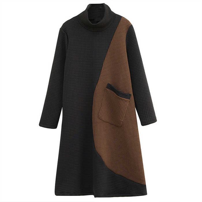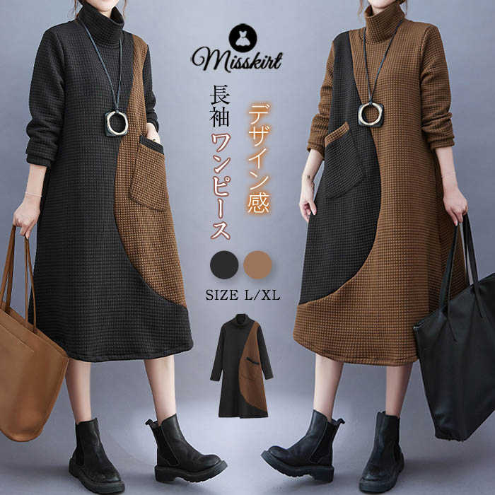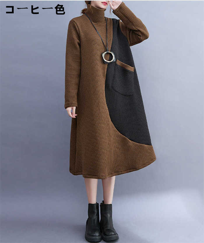 ワンピース レディース ハイネック タートルネック ワンピ 配色 切り替え 膝丈 長袖 秋 冬 シンプル おしゃれ 無地 体型カバー ポケット付き レトロ エレガント カジュアル お洒落 通勤 OL