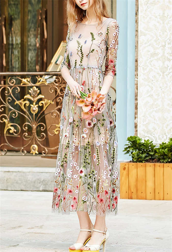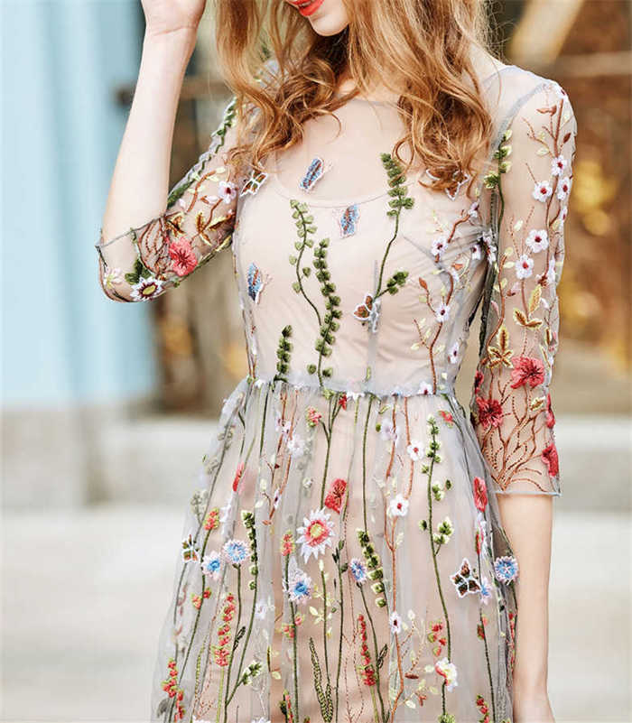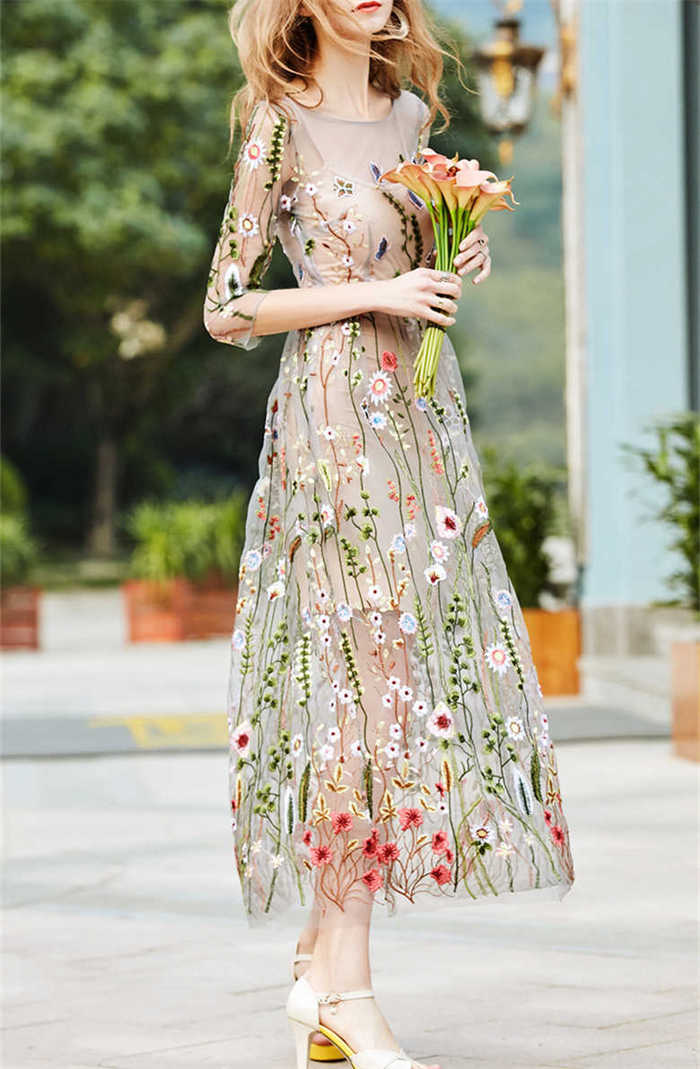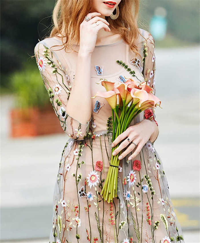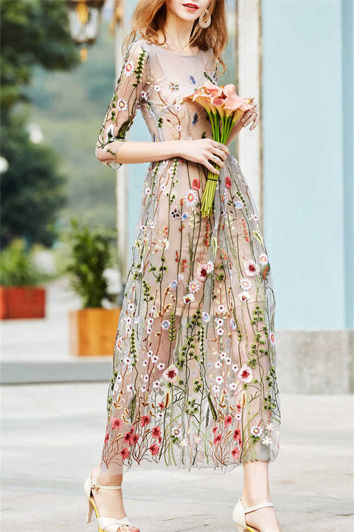 ワンピース ロング ワンピ レディース ロングワンピース 刺繍 花柄 チュール ラウンドネック プリント 五分袖 春 夏 プルオーバー 体型カバー 着瘦せ レトロ 中華風 リゾート風 エレガント セレ