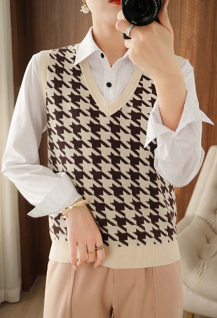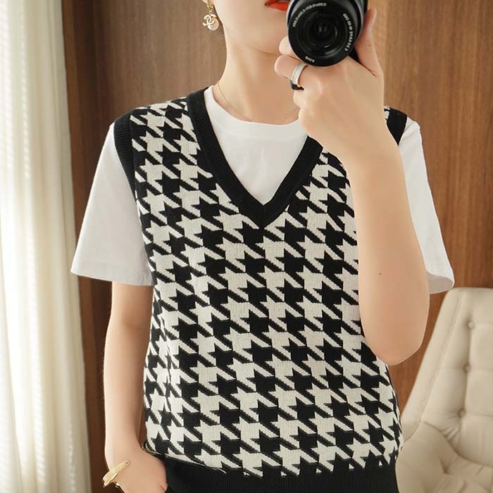 ニットベスト 千鳥格子 レディース ベスト Vネック トップス 重ね着 定番 ニット きれいめ ノースリーブ カジュアル 大人 かわいい シンプル 春 秋 冬 コーデやすい