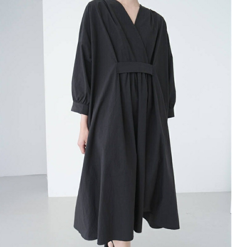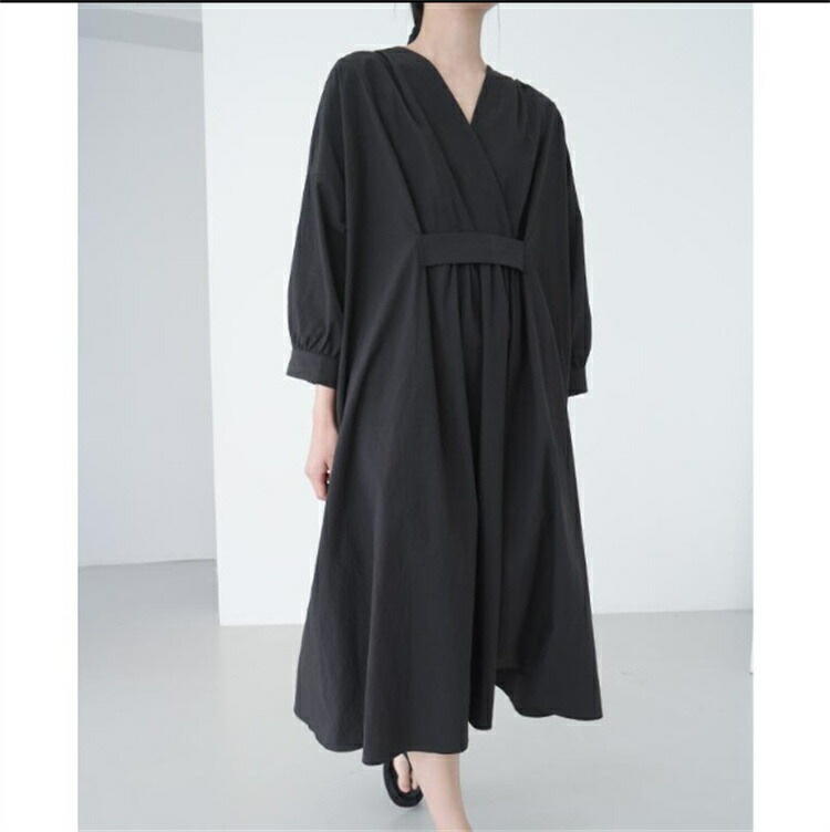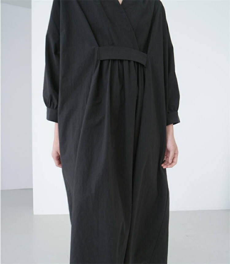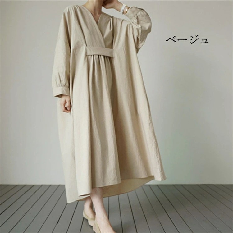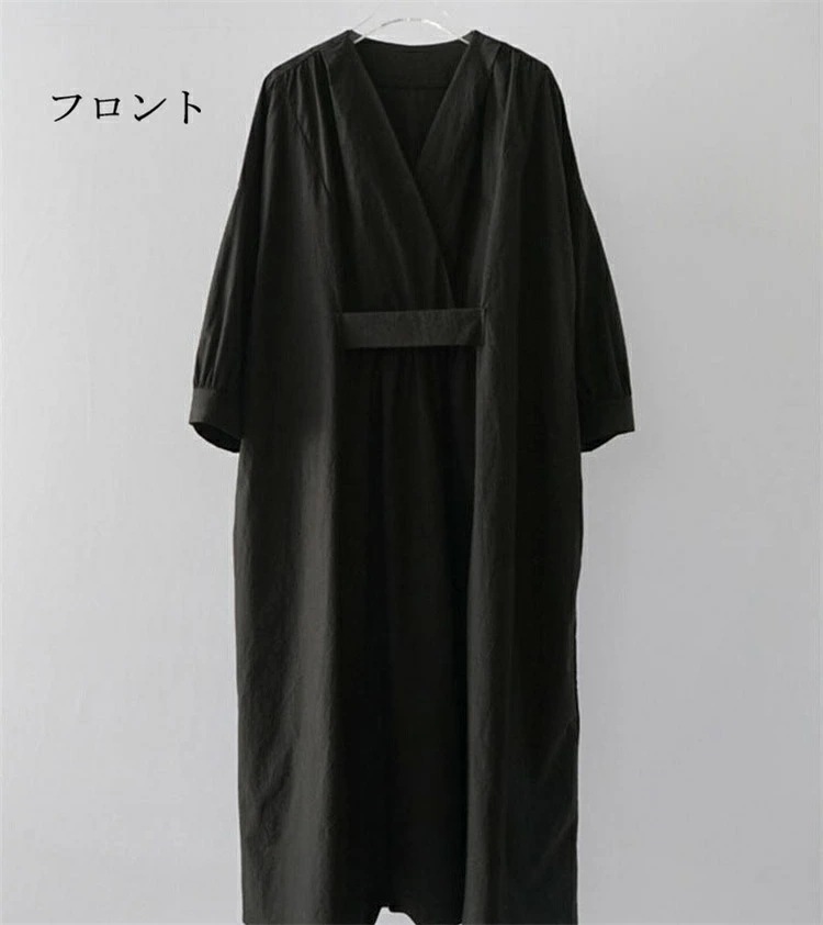 ロングワンピース レディース きれいめ 春 秋 冬 長袖 マキシワンピース タック ギャザー マキシ丈ワンピース 黒 ワンピース ゆるっと 綿 麻 シャツワンピース ロング Vネック 無地 ワンピース