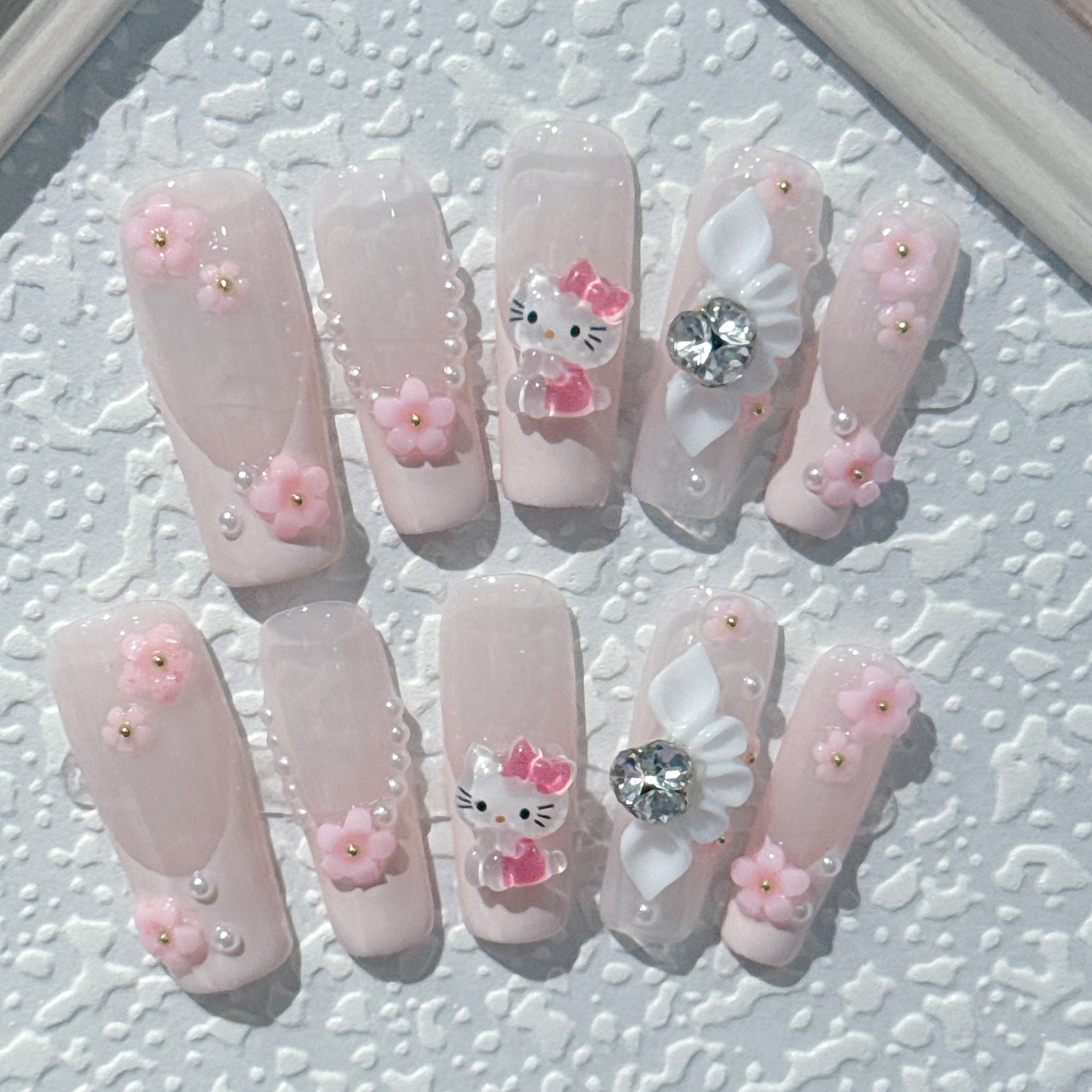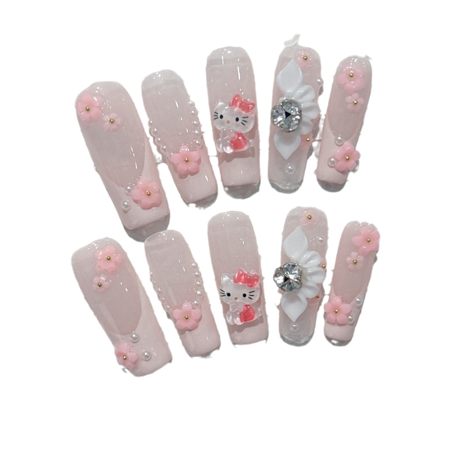 甲のフランスの子猫のピンクの花を着てかわいい甲片の美甲片を着ます ネイルチップ