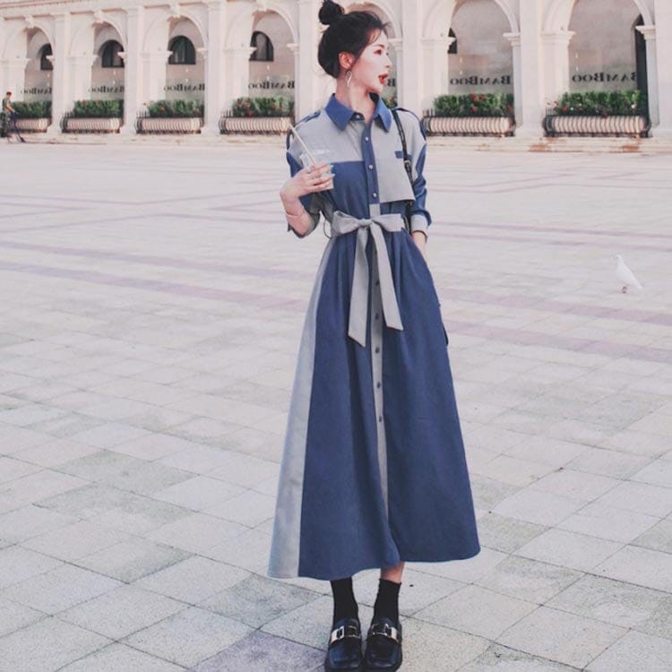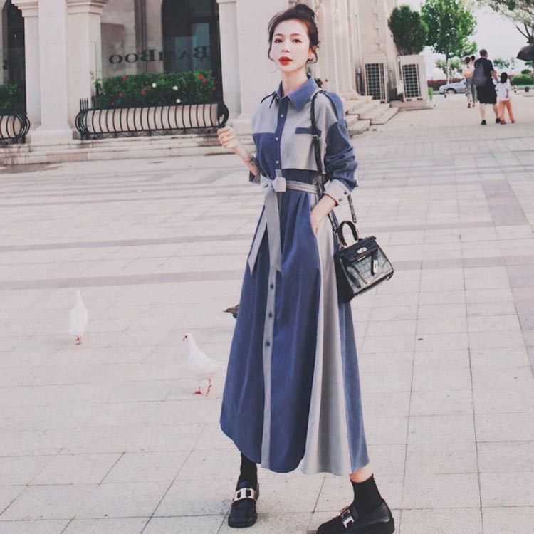 シャツワンピース配色レディースおしゃれデニム風長袖パッチワークマキシワンピースロングコートスプリングコートウエストベルト付きロングワンピーストレンチコート大人可愛い薄