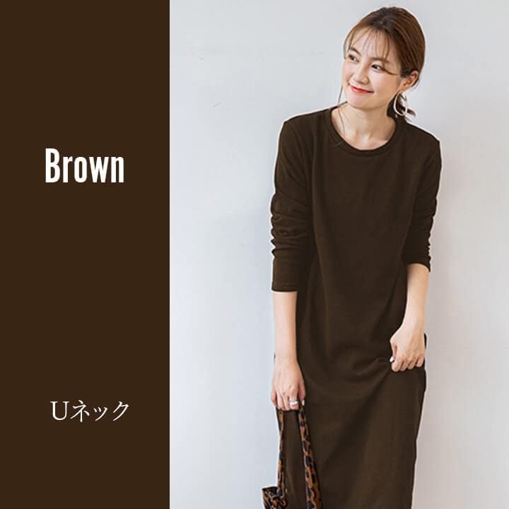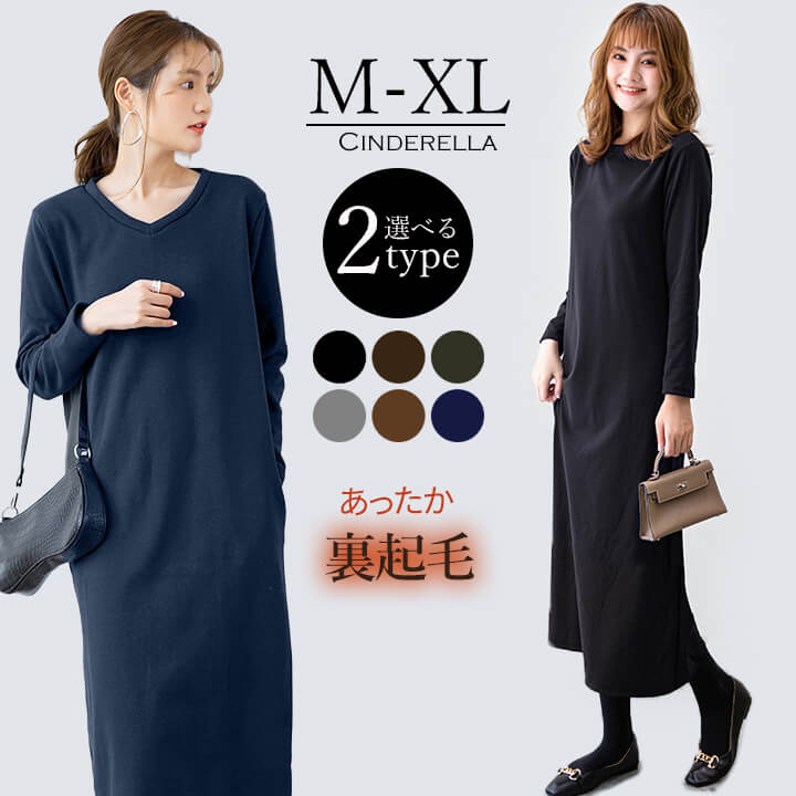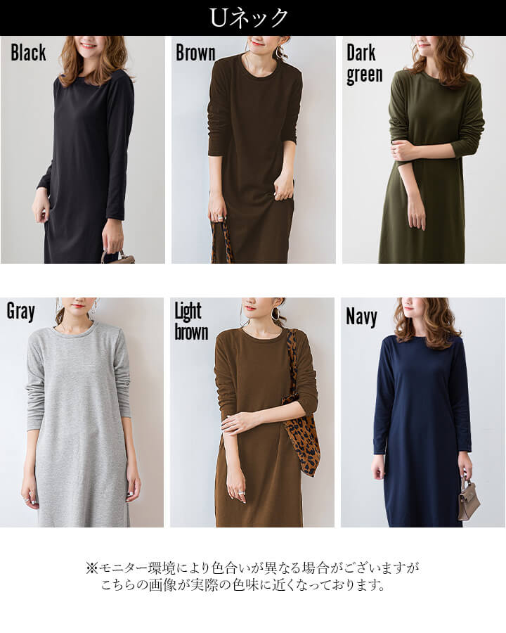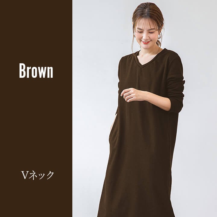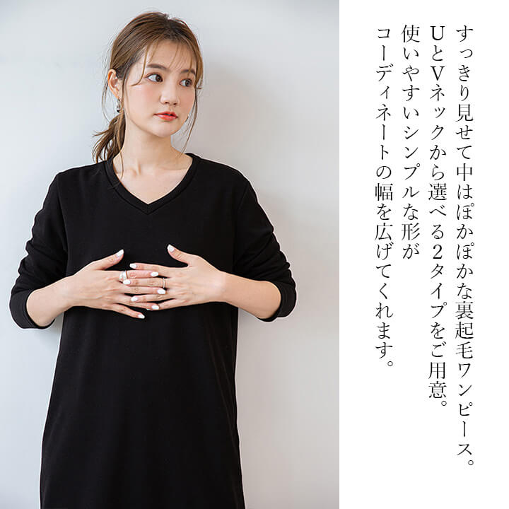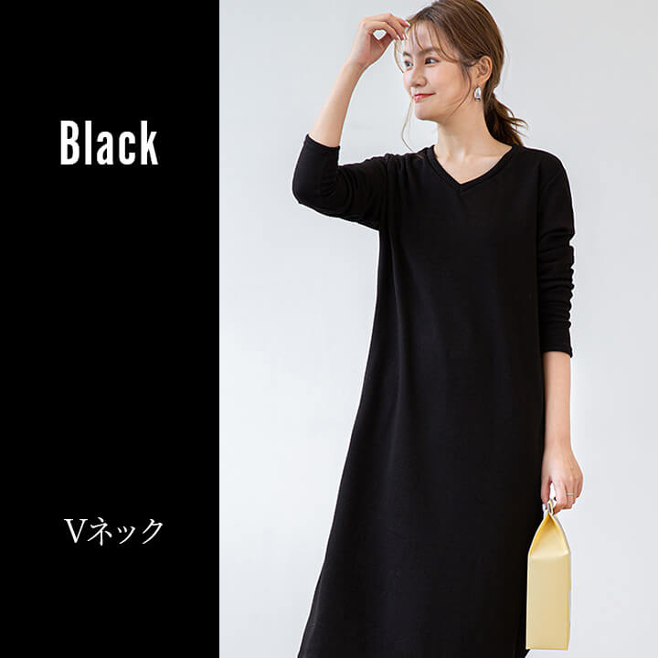 ワンピース 裏起毛 Vネック Uネック 温かい あったかい お洒落 スウェット生地 シンプル 厚手 秋 冬 ミモレ丈 エレガント 大人 落ち着き ママ レディース ブラック 黒 ブラウン 茶 ダークグ