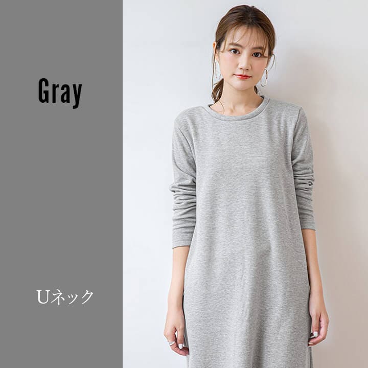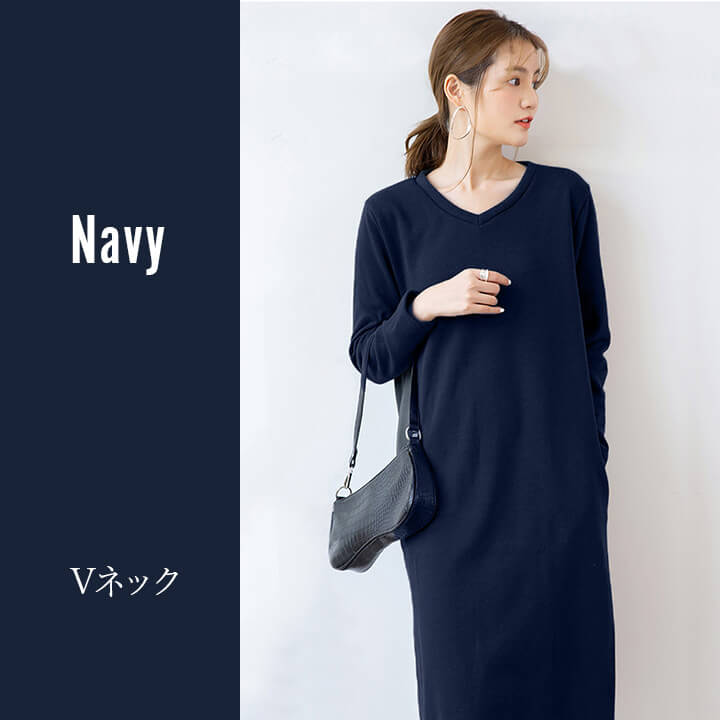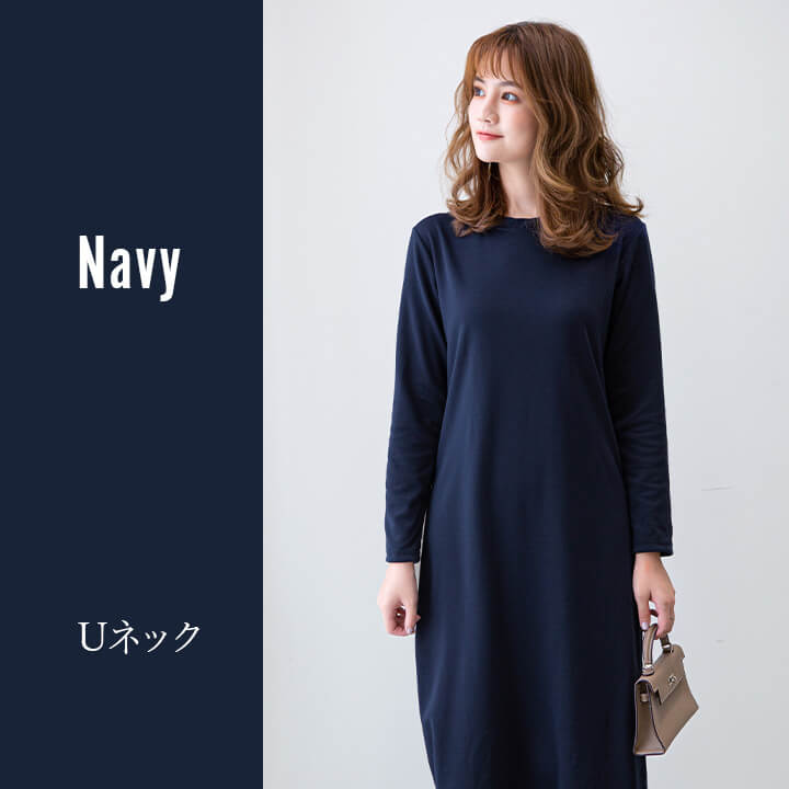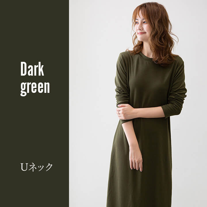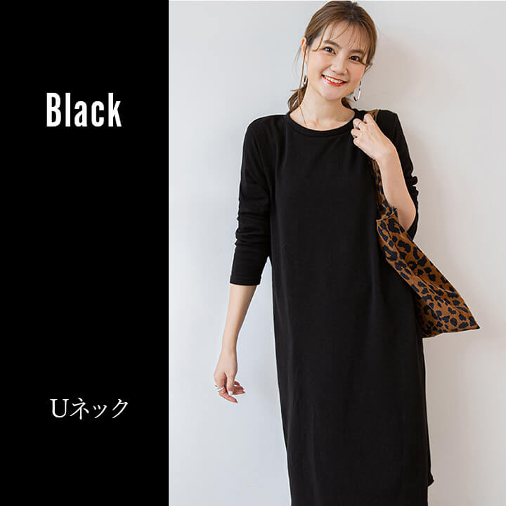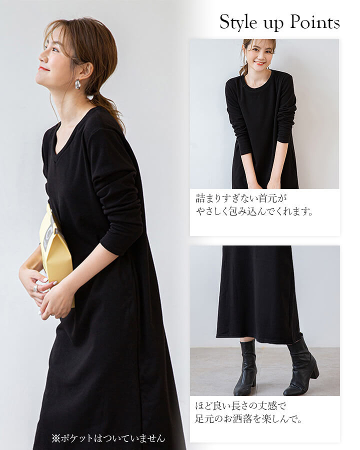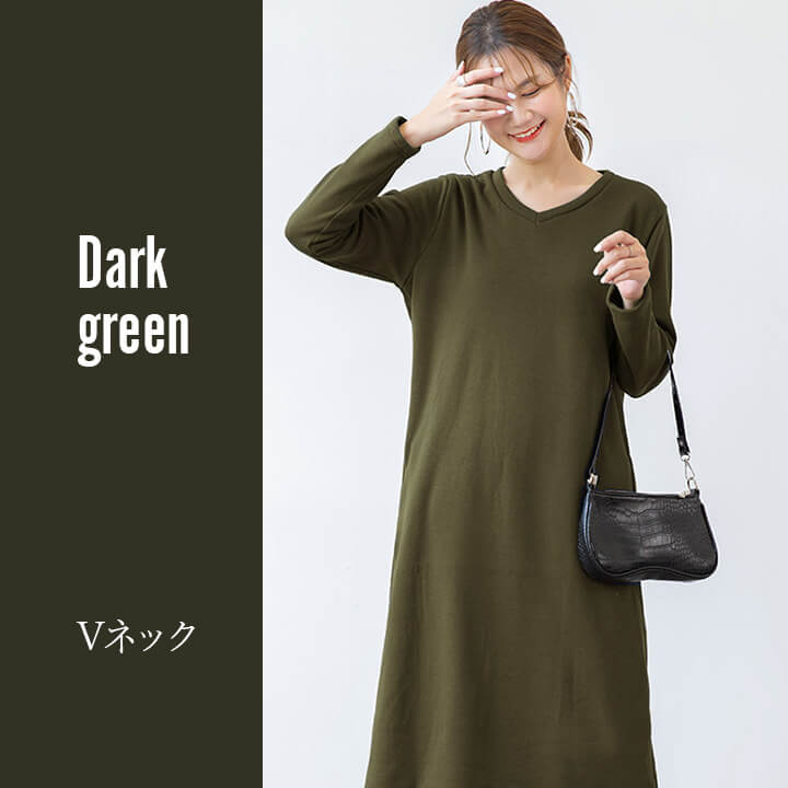 ワンピース 裏起毛 Vネック Uネック 温かい あったかい お洒落 スウェット生地 シンプル 厚手 秋 冬 ミモレ丈 エレガント 大人 落ち着き ママ レディース ブラック 黒 ブラウン 茶 ダークグ