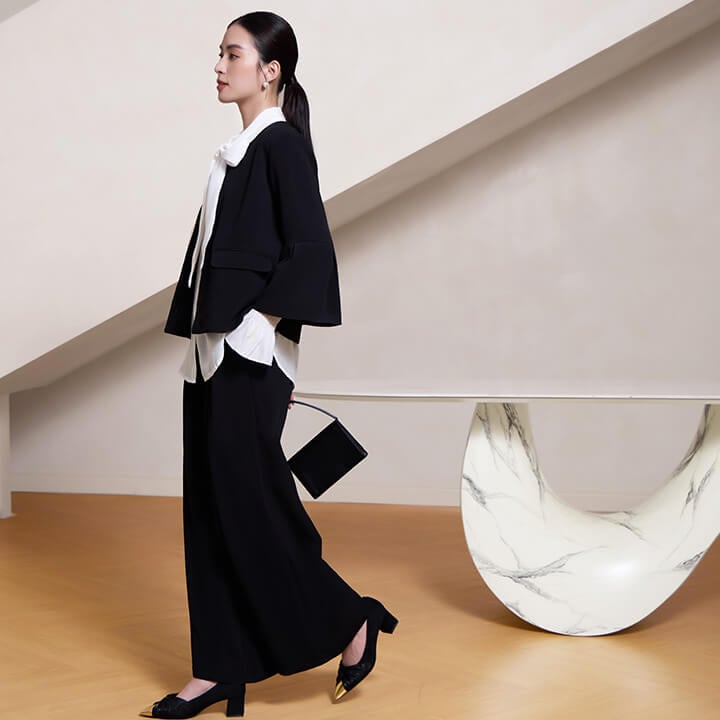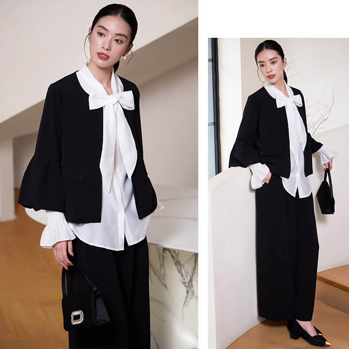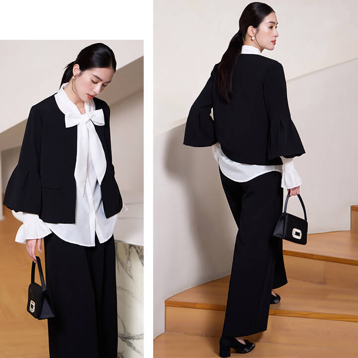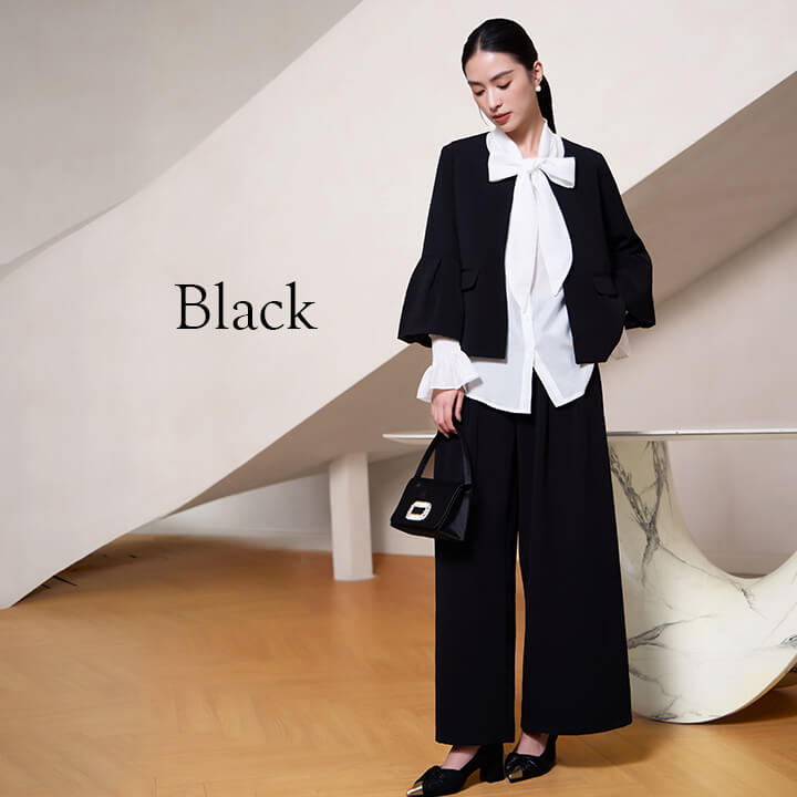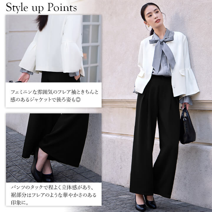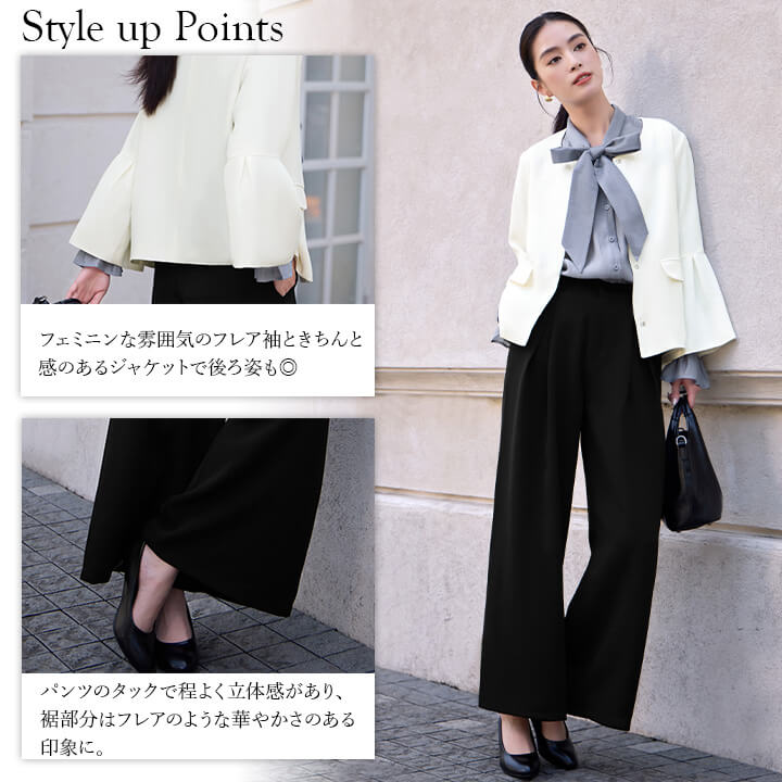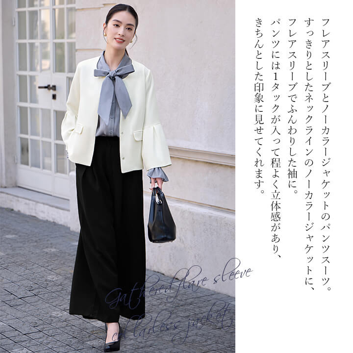 ■フレアスリーブとノーカラージャケットのパンツスーツ。