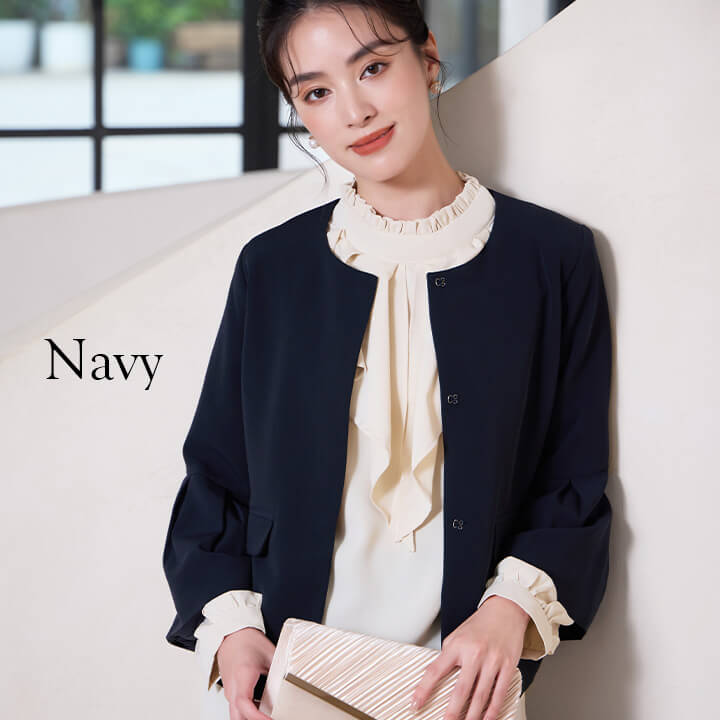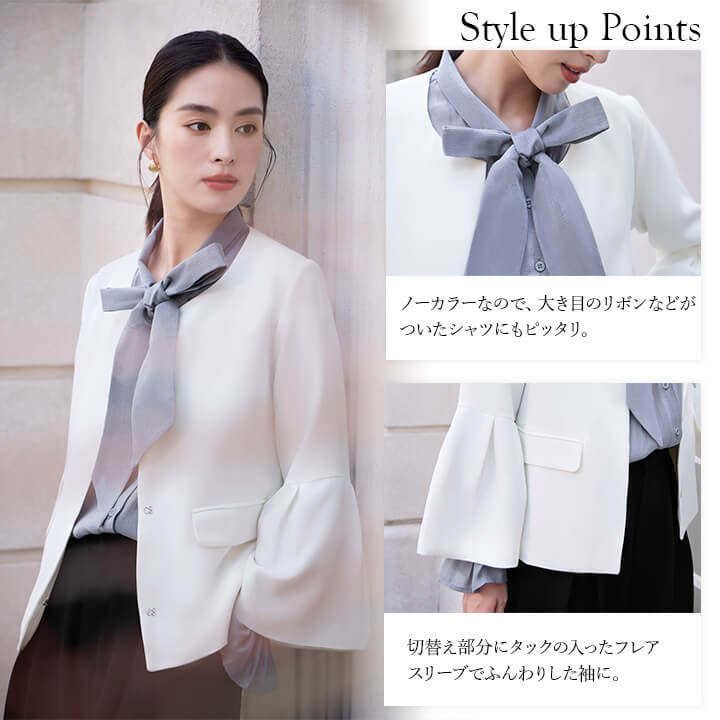 ■すっきりとしたネックラインのノーカラージャケットに、フレアスリーブでふんわりした袖に。