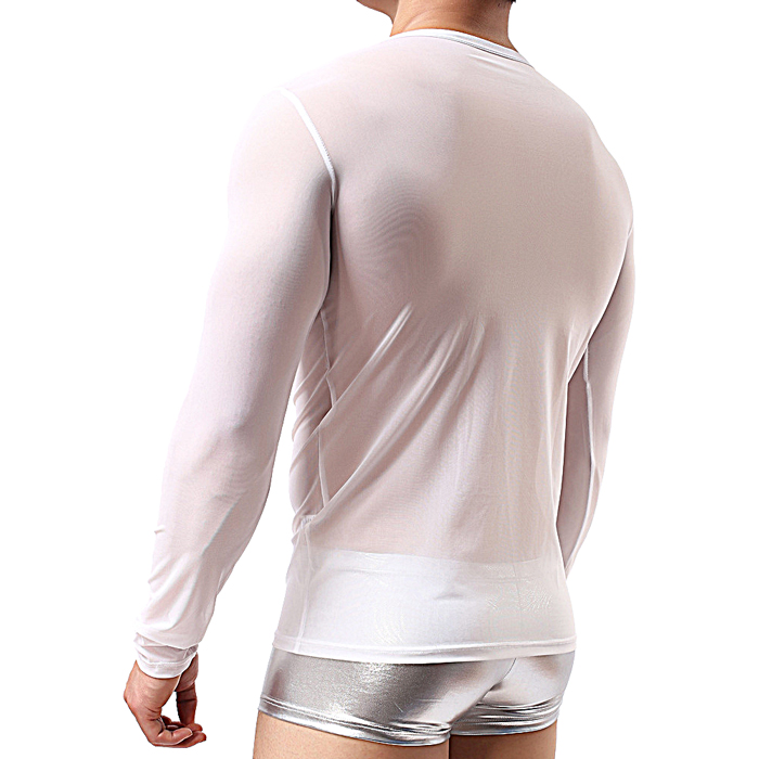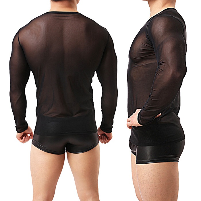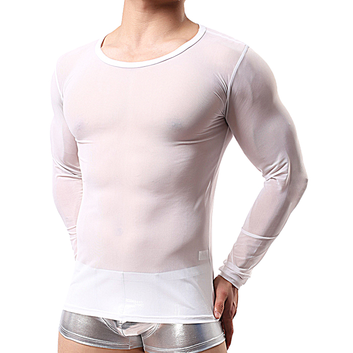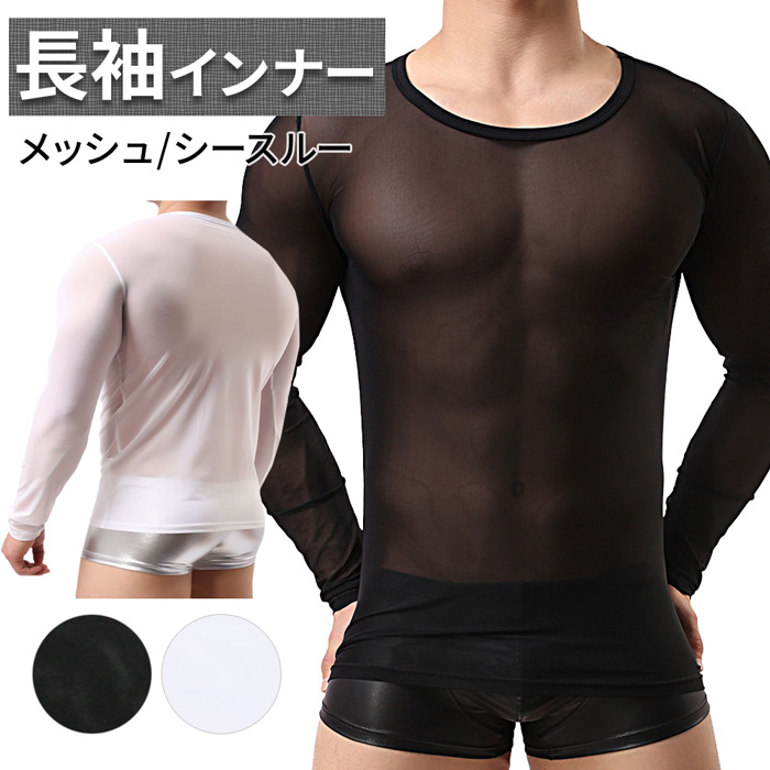 長袖インナー 透ける シースルー メッシュ メンズ 下着 セクシー クルーネック 男性 速乾性 通気性 個性的 無地 M L XL 黒白 mr-003