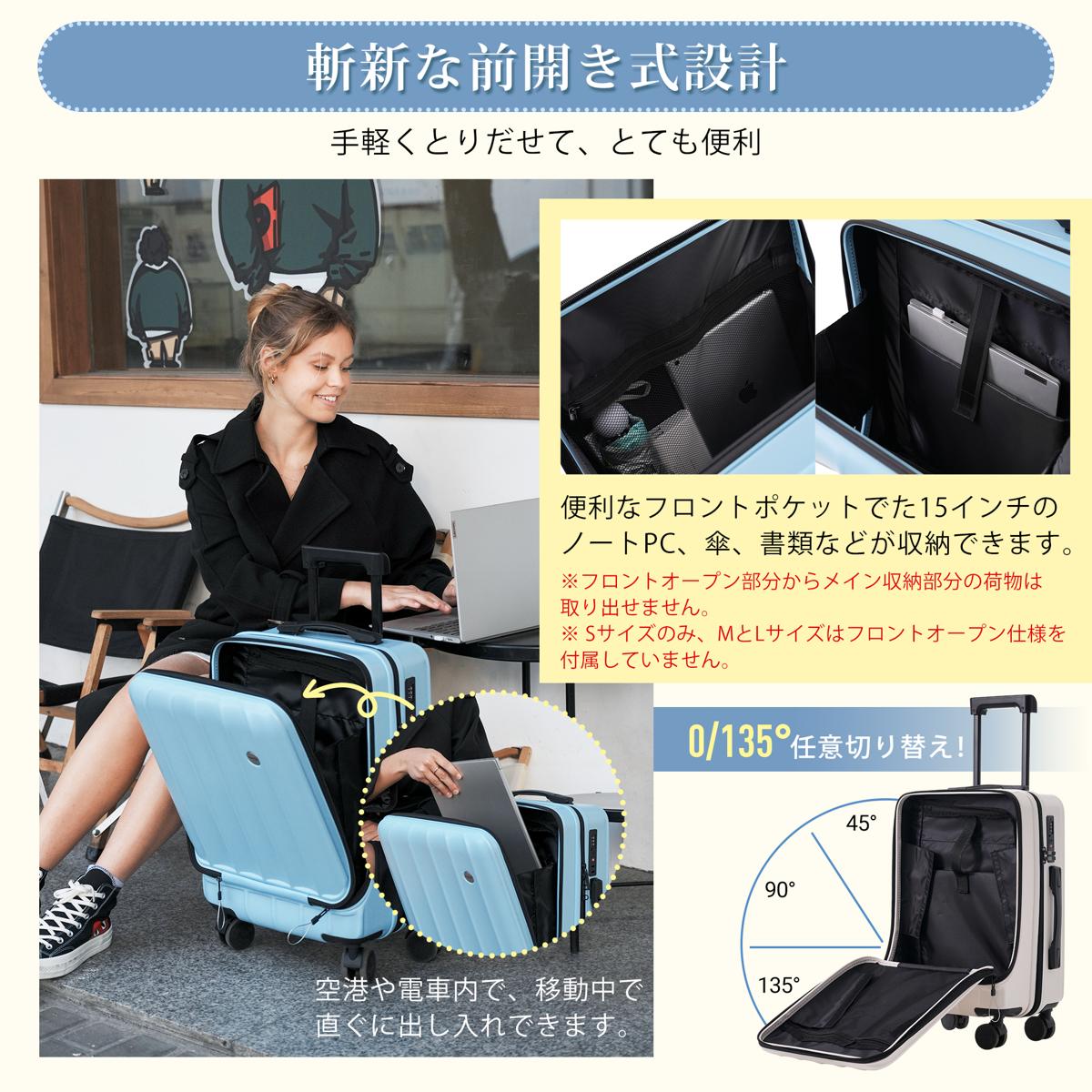 【フロントオープン】立てたまま荷物の出し入れができる便利なフロントオープンスーツケースです。15インチまでパソコンやタブレット、パスポートなど荷物に合わせた細かなポケットがあり、空港や新幹線の中、旅の途中でも、前ポケットから出したいものを簡単に取り出すことができ、子連れの方やビジネスシーンでも活躍しています。ご注意 ①※Sサイズのみ、MとLサイズはフロントオープン仕様を付属していません。②※フロントオープン部分からメイン収納部分の荷物は取り出せません。
