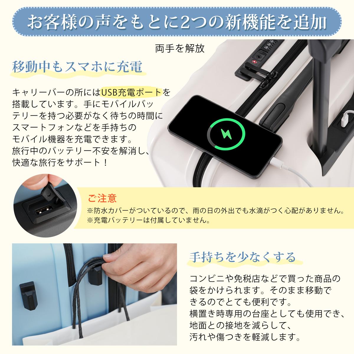 【充電用USBポート】キャリーバーの所にUSB充電ポートがあり、旅行中でもいつでも充電できます。ご注意※充電バッテリーは付属していません。ご了承ください。