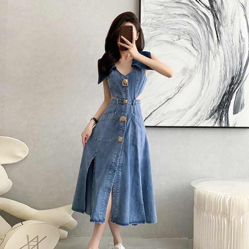 2025春秋デニムワンピースレディース気質大きな開襟袖なしワンピース韓国ファッションパーティードレスセクシーなワンピース着痩せして見える デニムワンピ