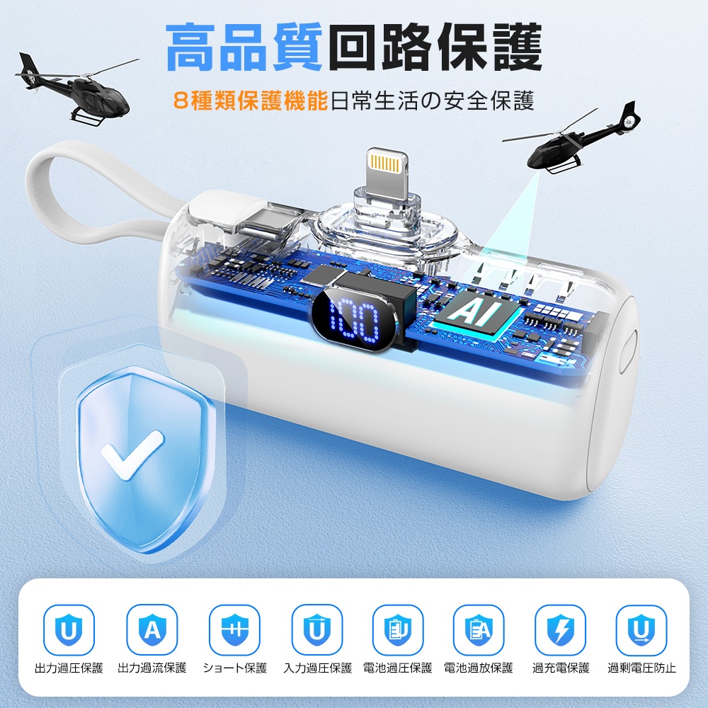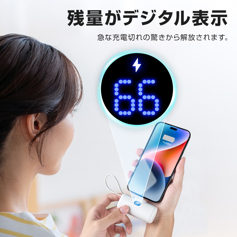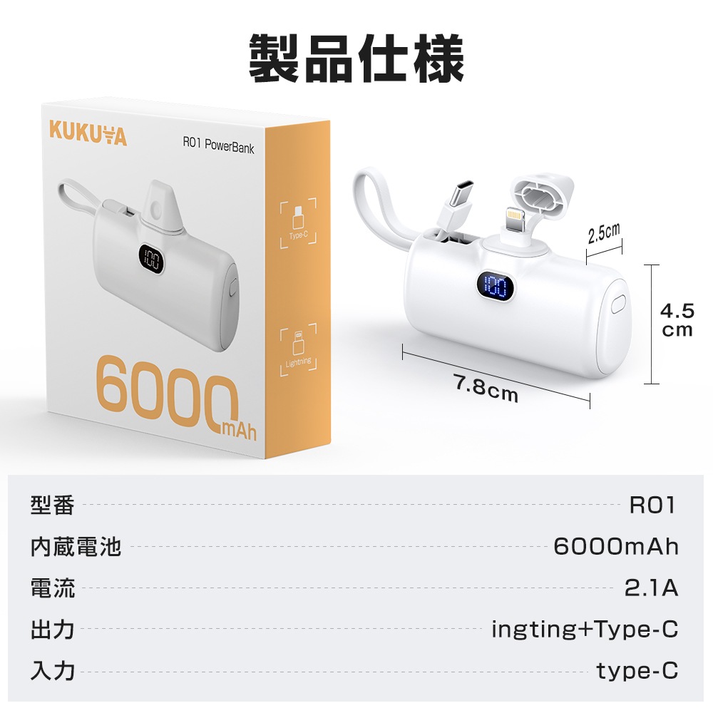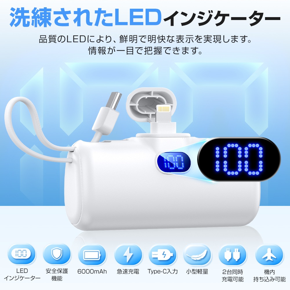 6000mAh 急速充電 モバイルバッテリー 軽量 小型 タイプc lighting iphone コンパクト コードレスダイレクトチャージ アンドロイコネクター内蔵