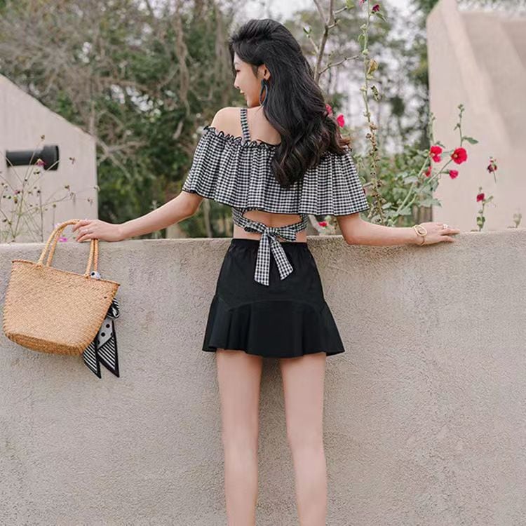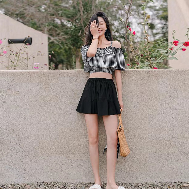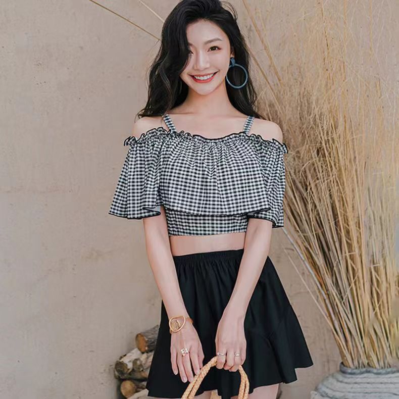 水着水着女性新しい夏のワンショルダーホルター水着韓国ins保守的なベリーシェーディングスキニースプリットスカート水着 水着セット