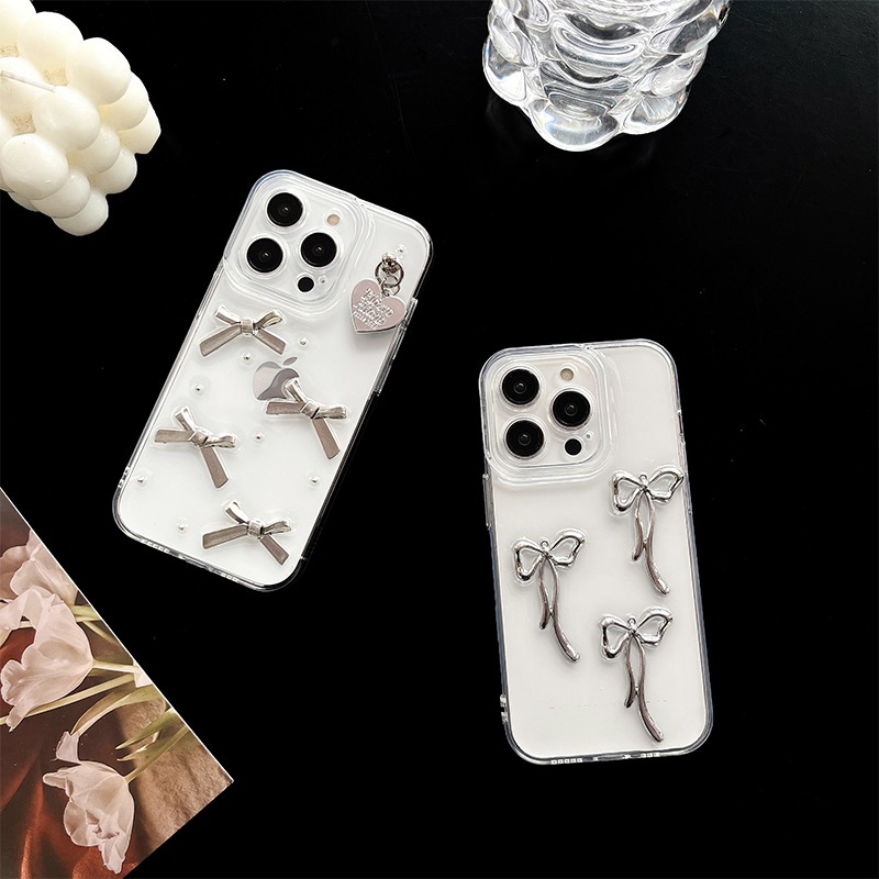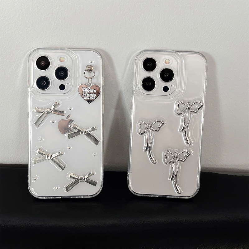 韓国インスタイルニッチ甘くて新鮮なシルバー立体リボンiphone15pro 14promax iphone 131211携帯電話ケース保護カバー