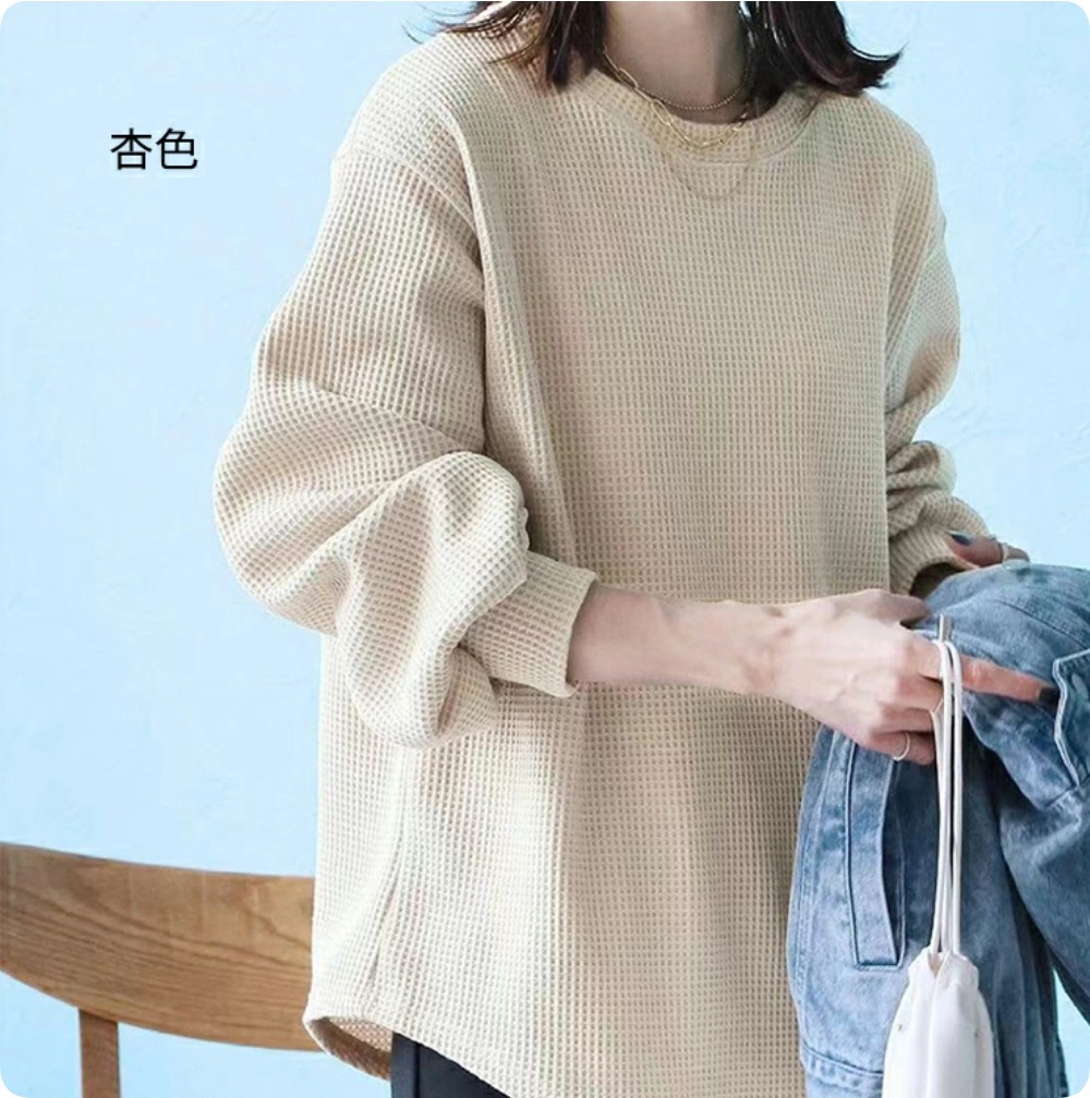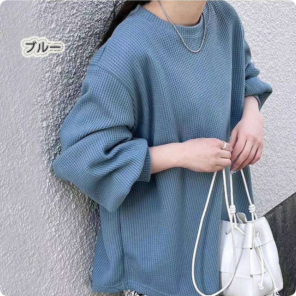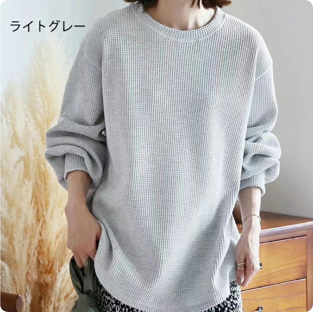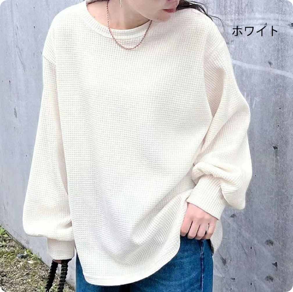 ワッフル ニット プルオーバー レディース サーマル カットソー ワッフル ロンT トップス 無地 長袖 Tシャツ ロング ロングTシャツ チュニック きれいめ 丸首 お洒落