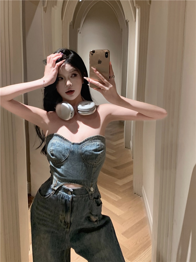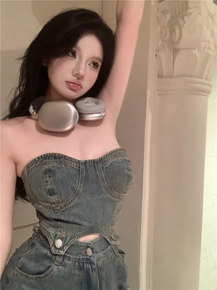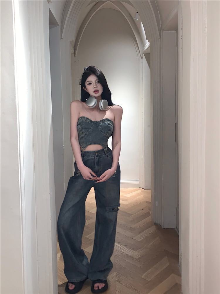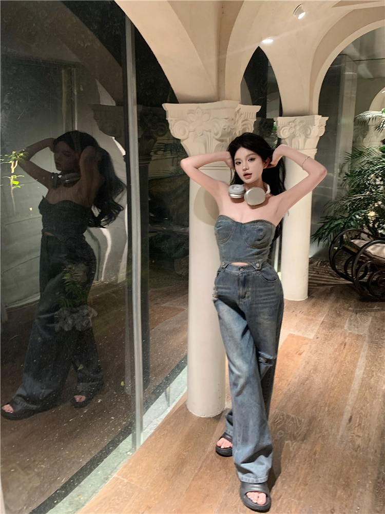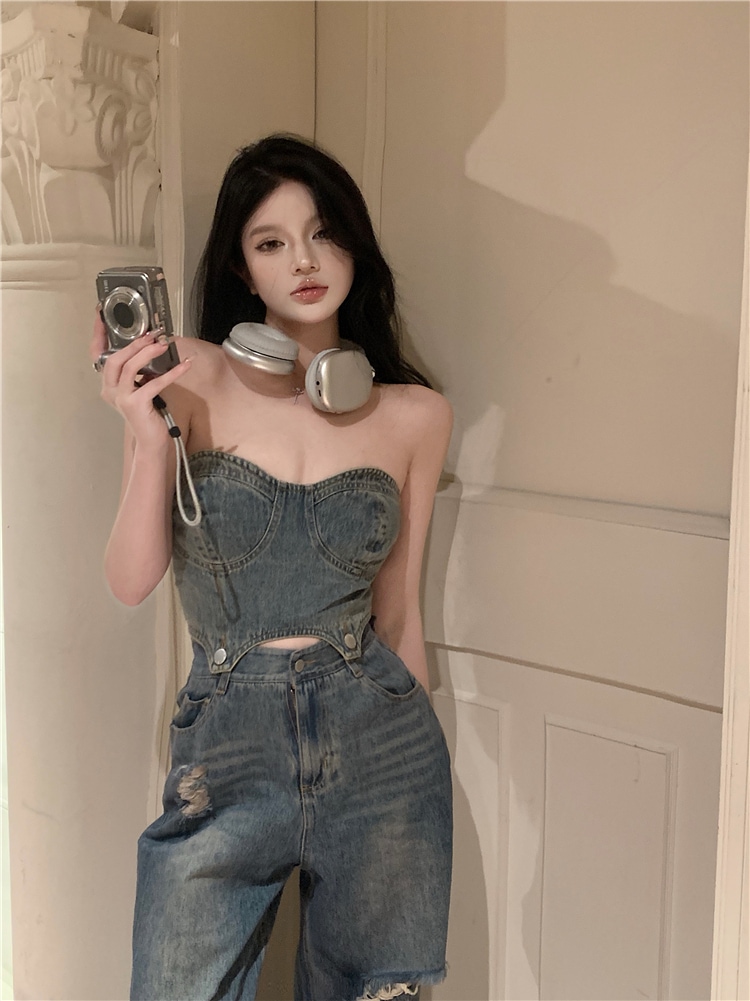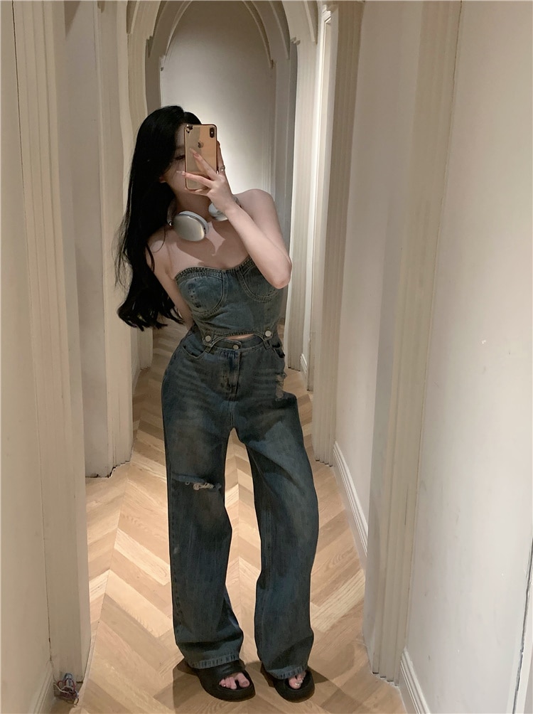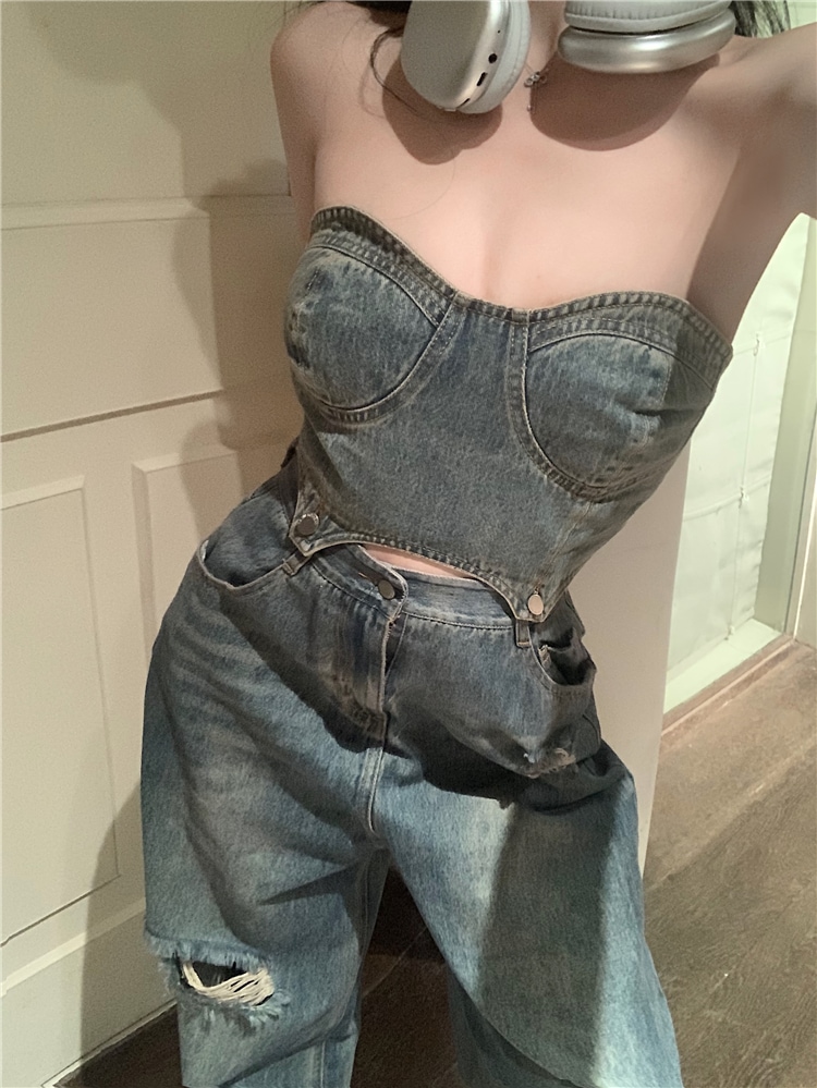 デニム ハイウエスト ワイドパンツ セットアップ ショート チューブトップ デニムパンツ ジーンズ ジーパン クラッシュド ダメージ ウォッシュ加工 ゆるダボ ストリート