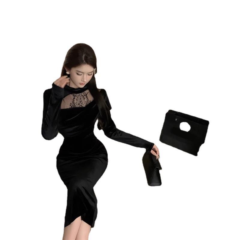 御姉様ヘップバーン風長袖ベルベットワンピース秋冬純欲レース宴会令嬢気質ドレスリトルブラックスカート女 長袖ロング マキシ丈ワンピ