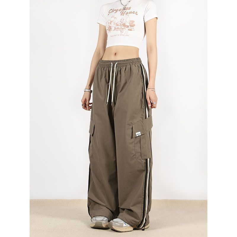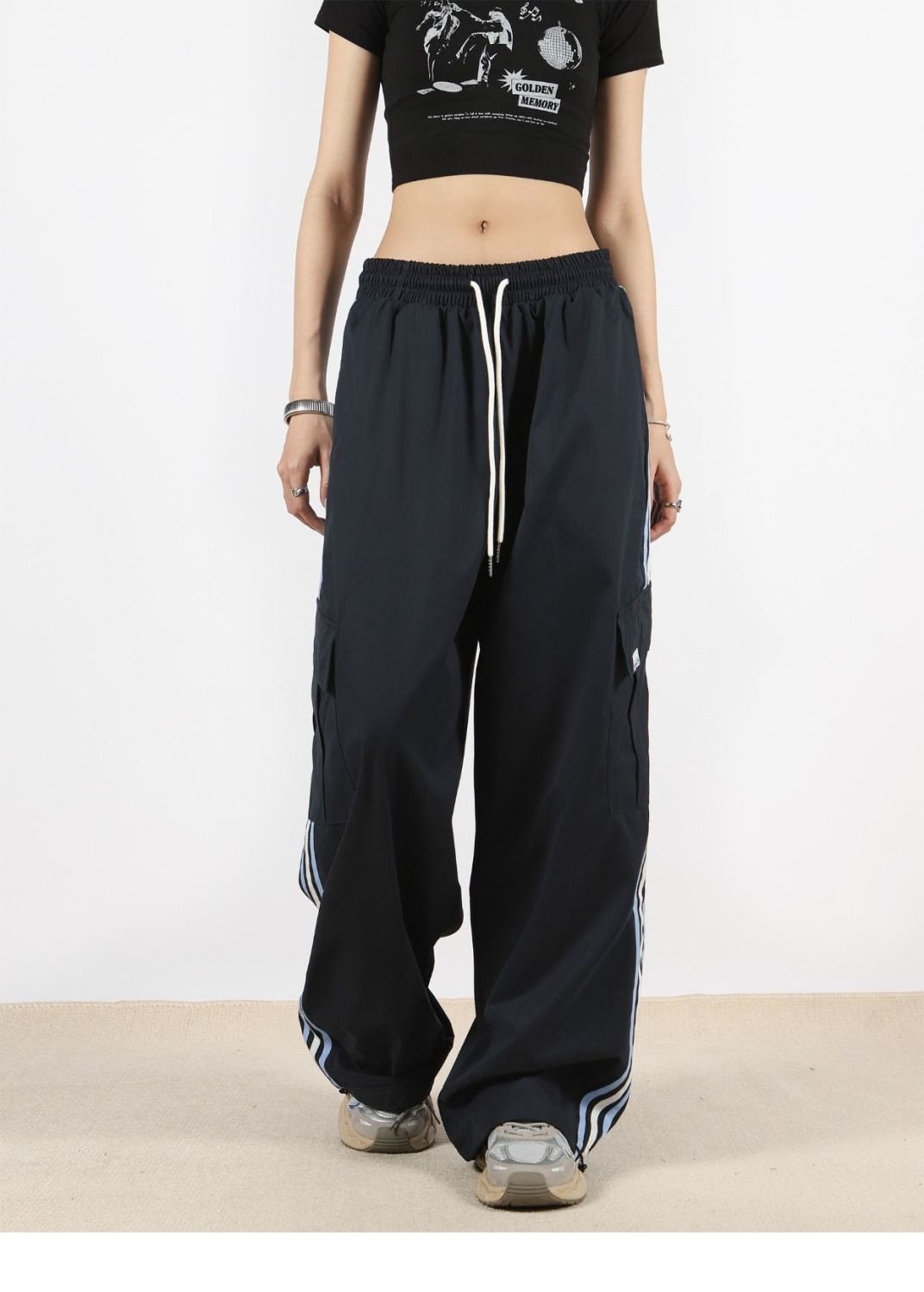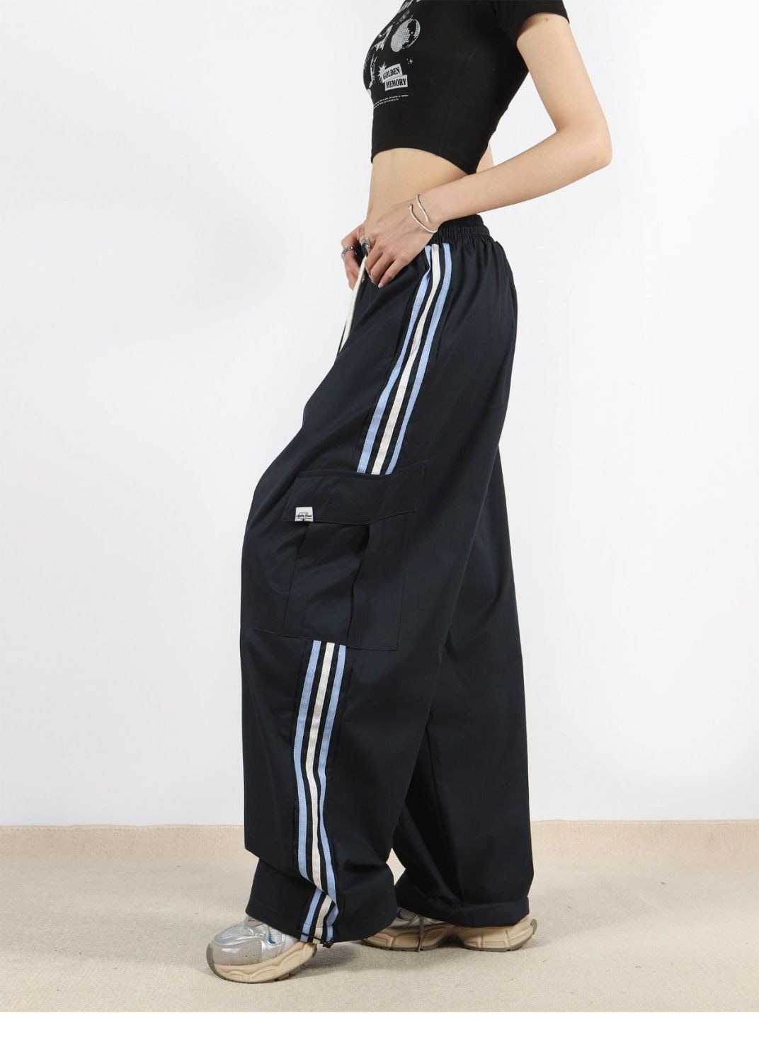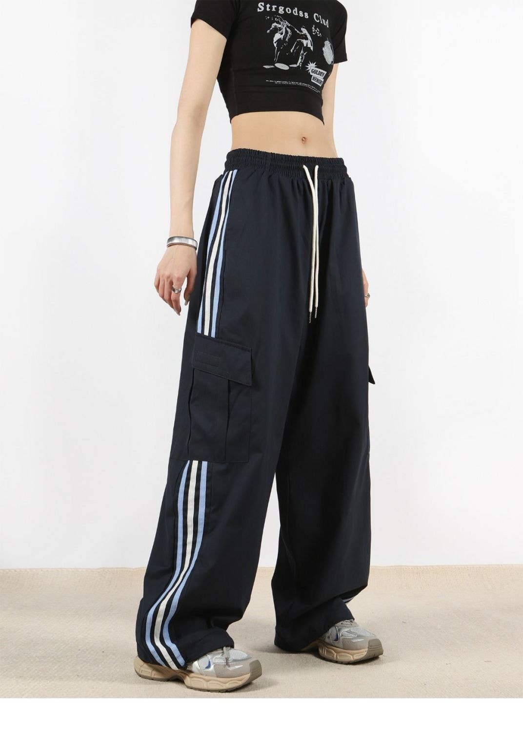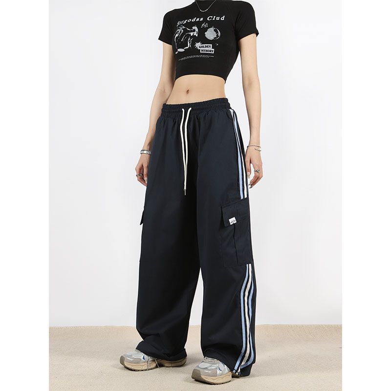 アメリカ三条バーストライプ工装ズボン女性レトロ高街ハイウエスト痩せスポーツカジュアルストレートカジュアルパンツ夏 ロングパンツ