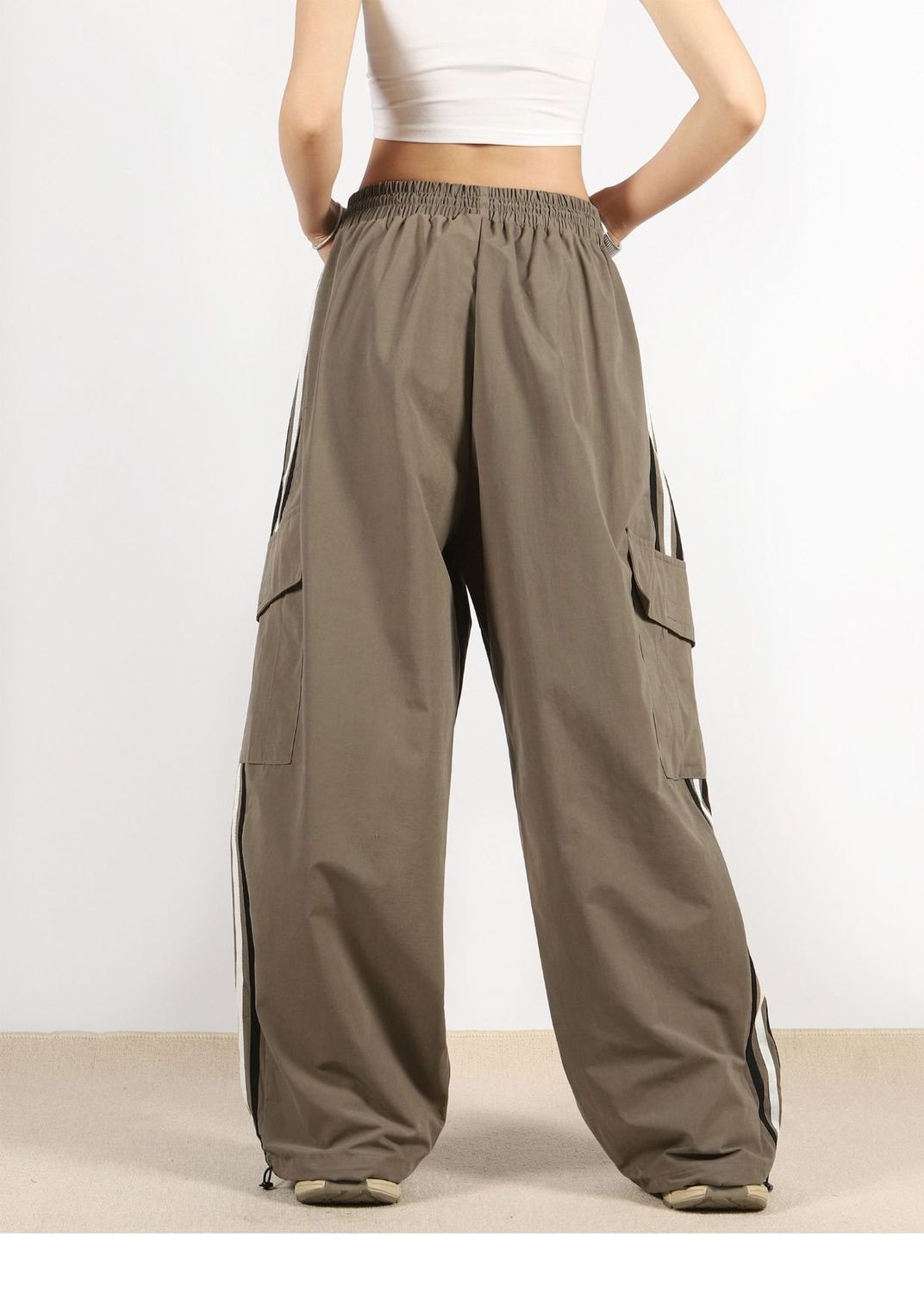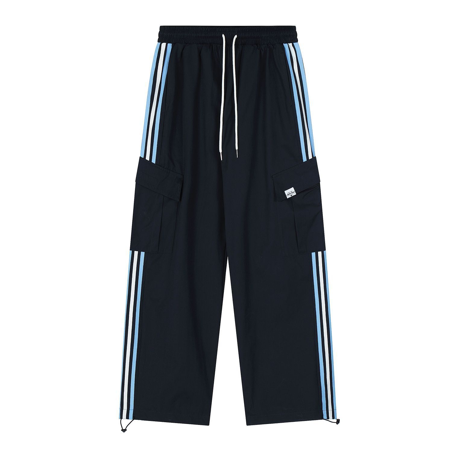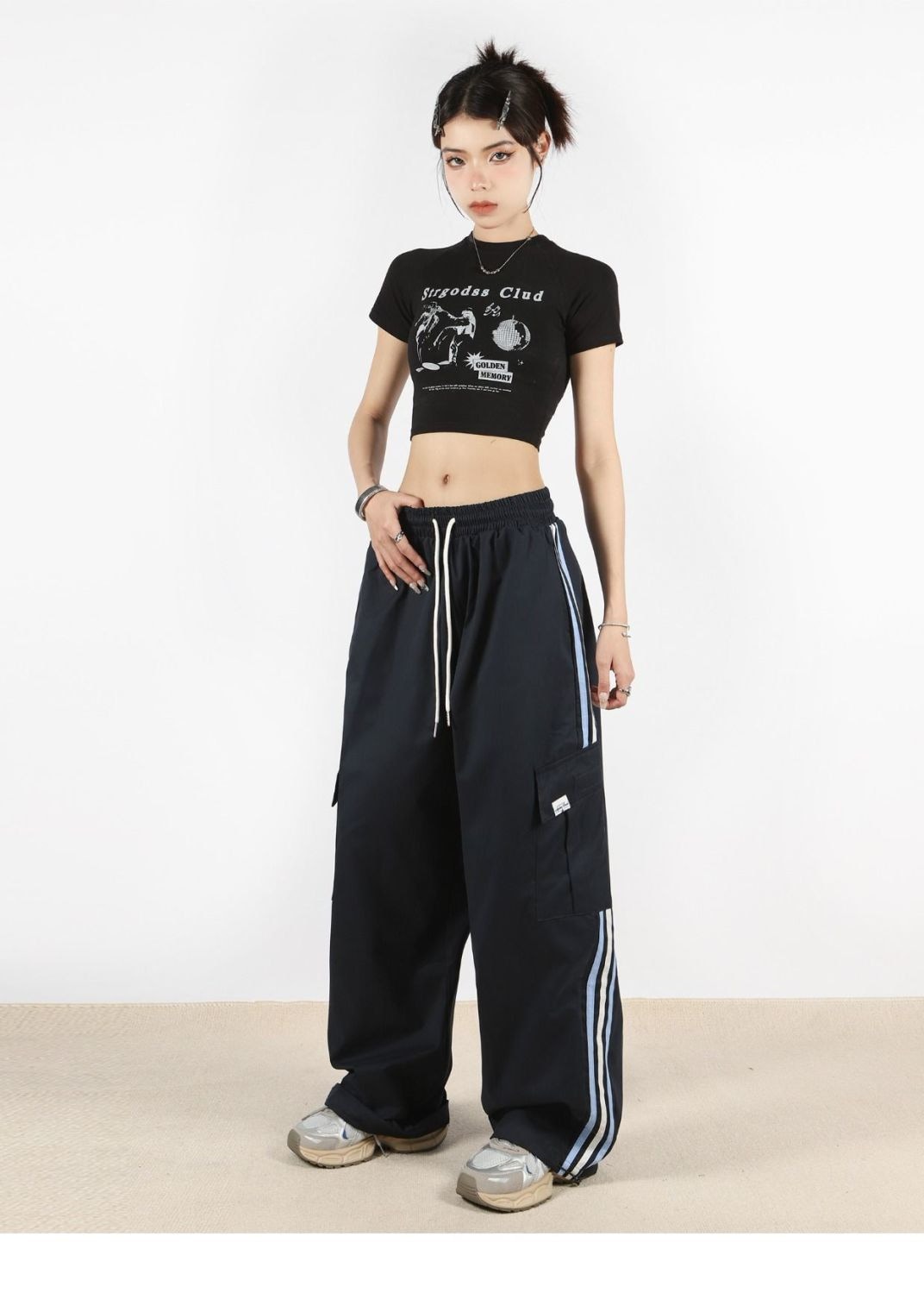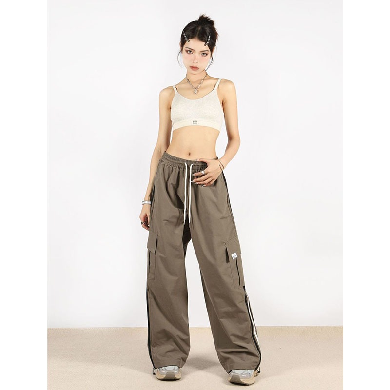 アメリカ三条バーストライプ工装ズボン女性レトロ高街ハイウエスト痩せスポーツカジュアルストレートカジュアルパンツ夏 ロングパンツ