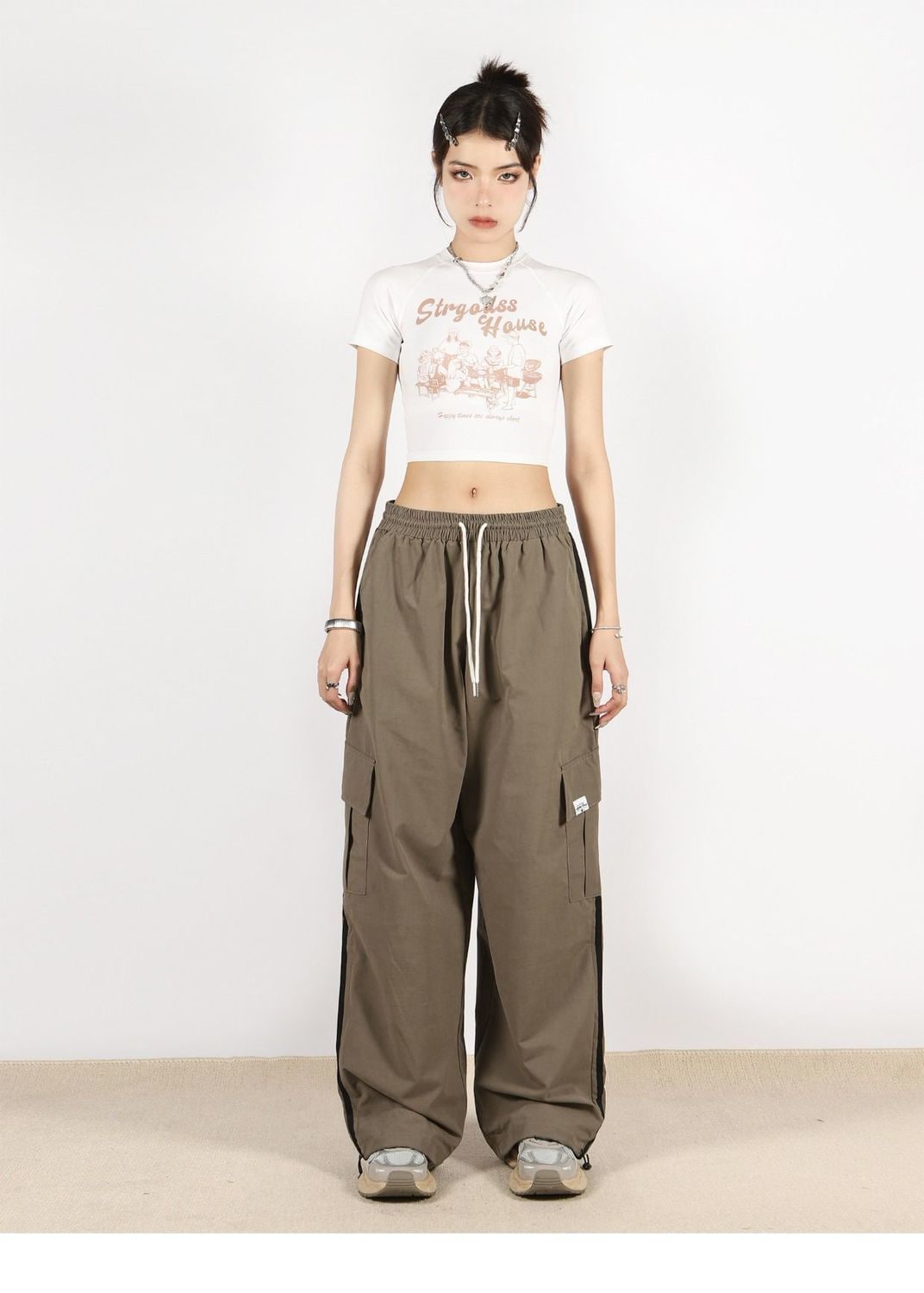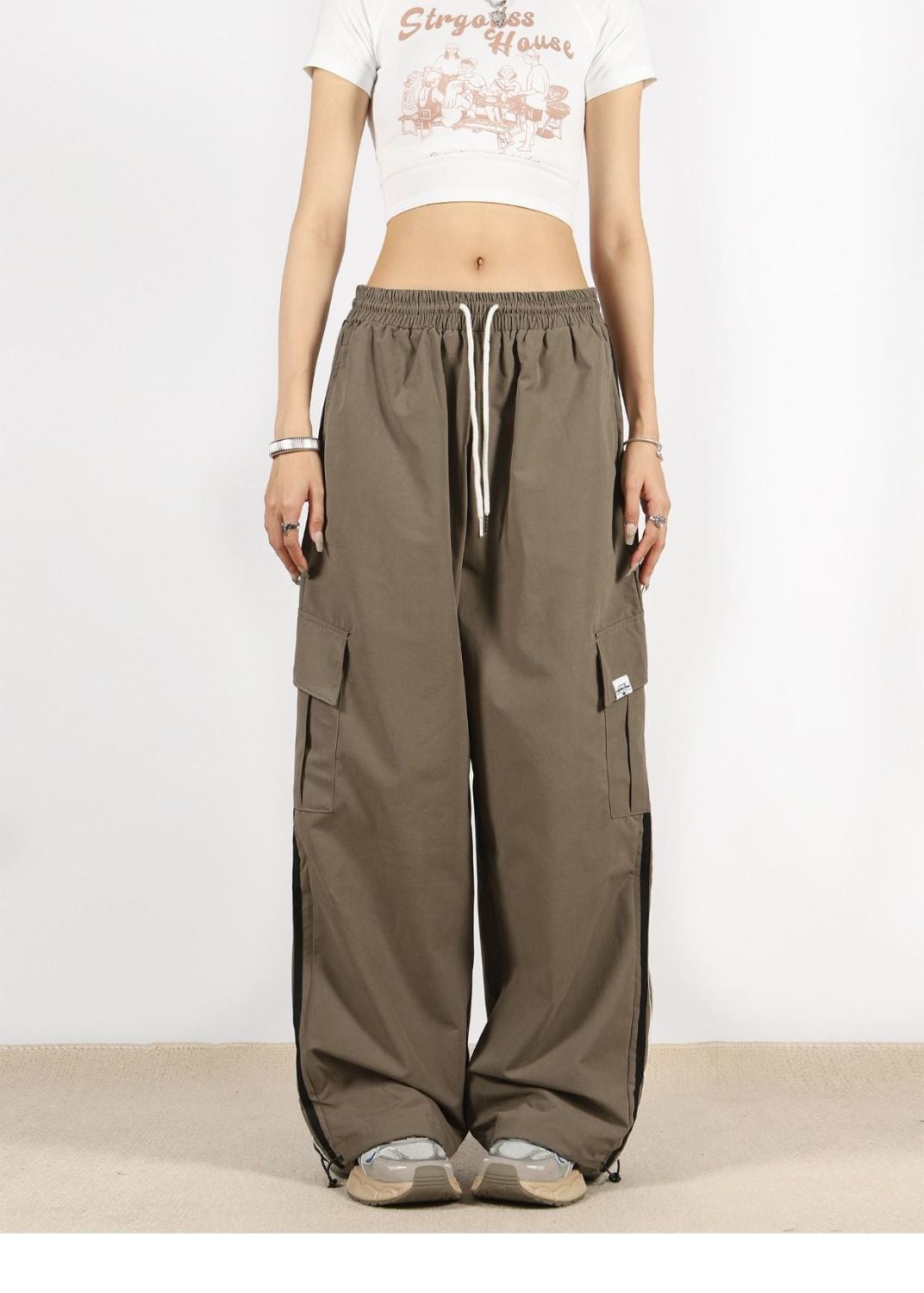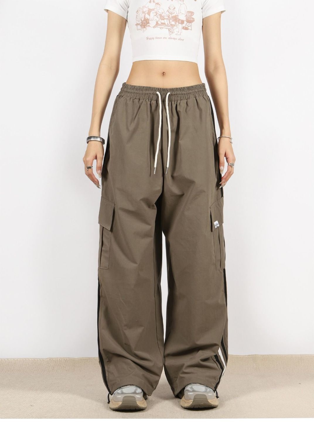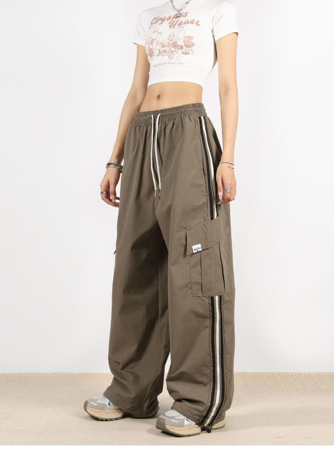 アメリカ三条バーストライプ工装ズボン女性レトロ高街ハイウエスト痩せスポーツカジュアルストレートカジュアルパンツ夏 ロングパンツ