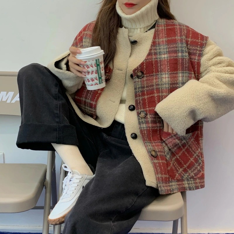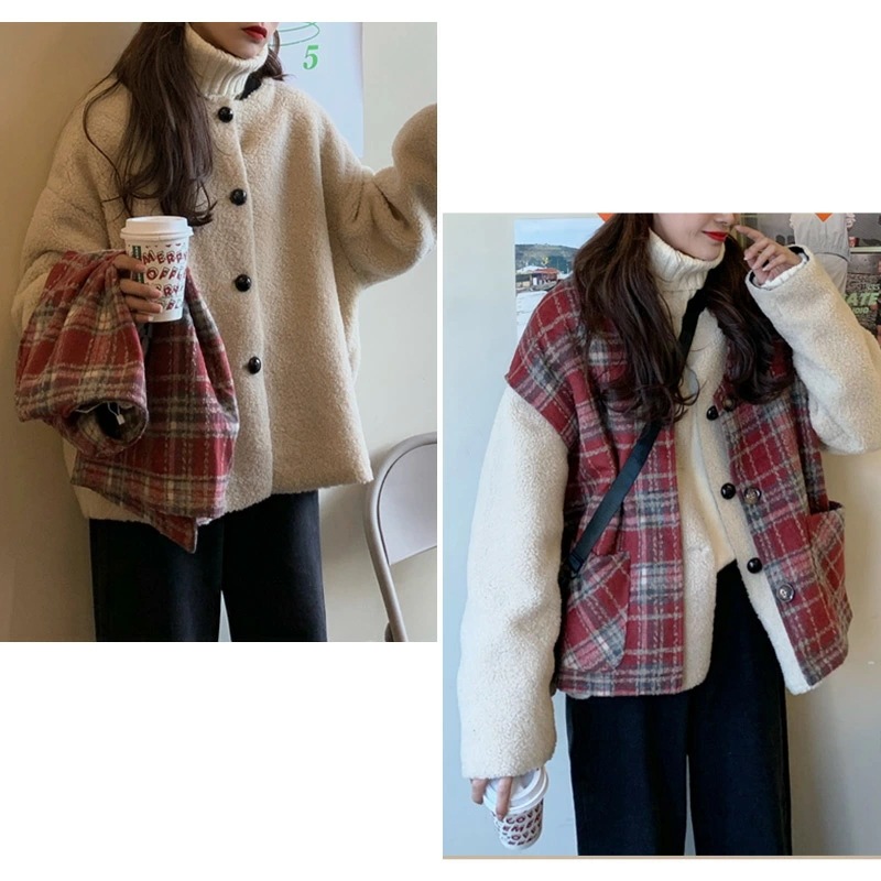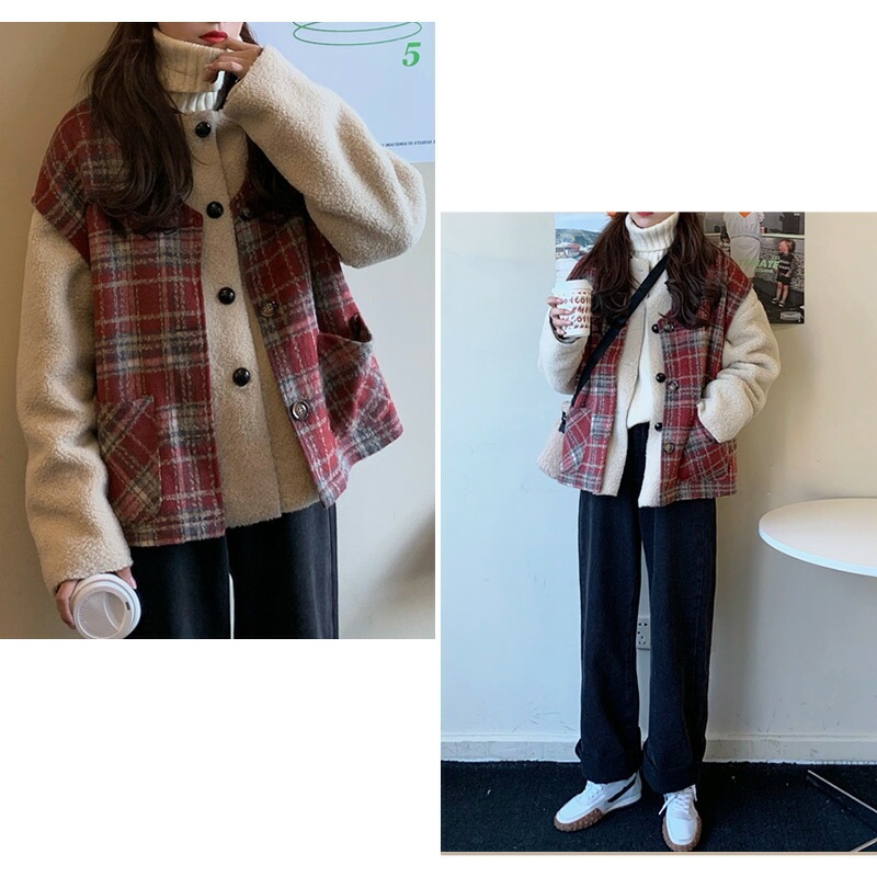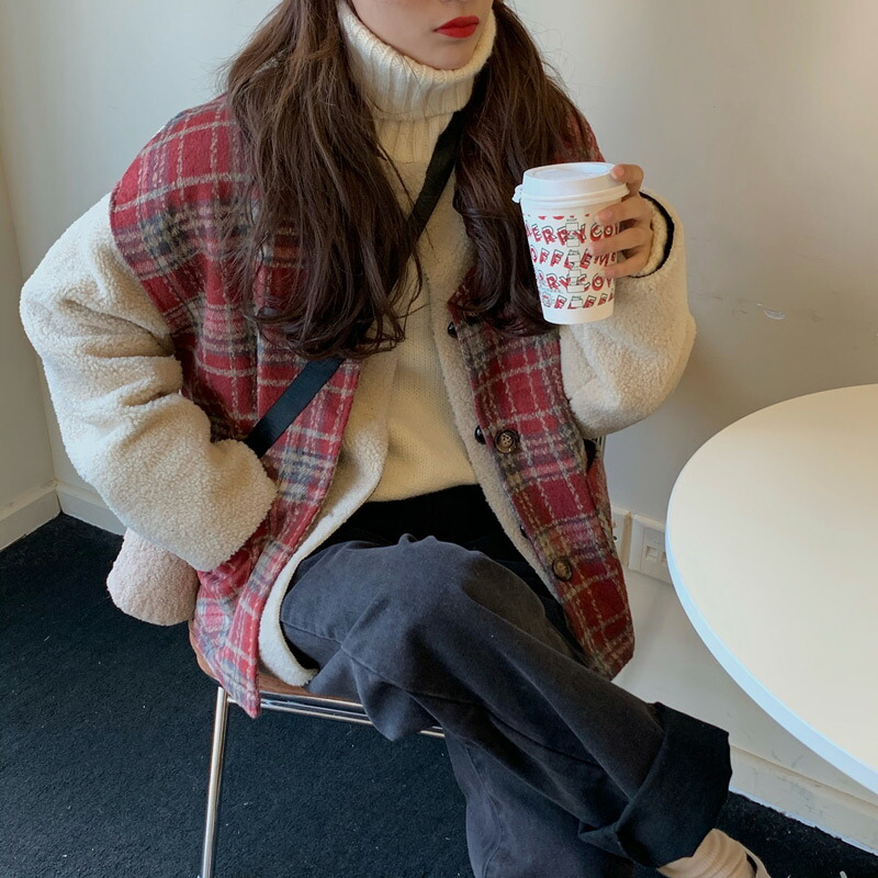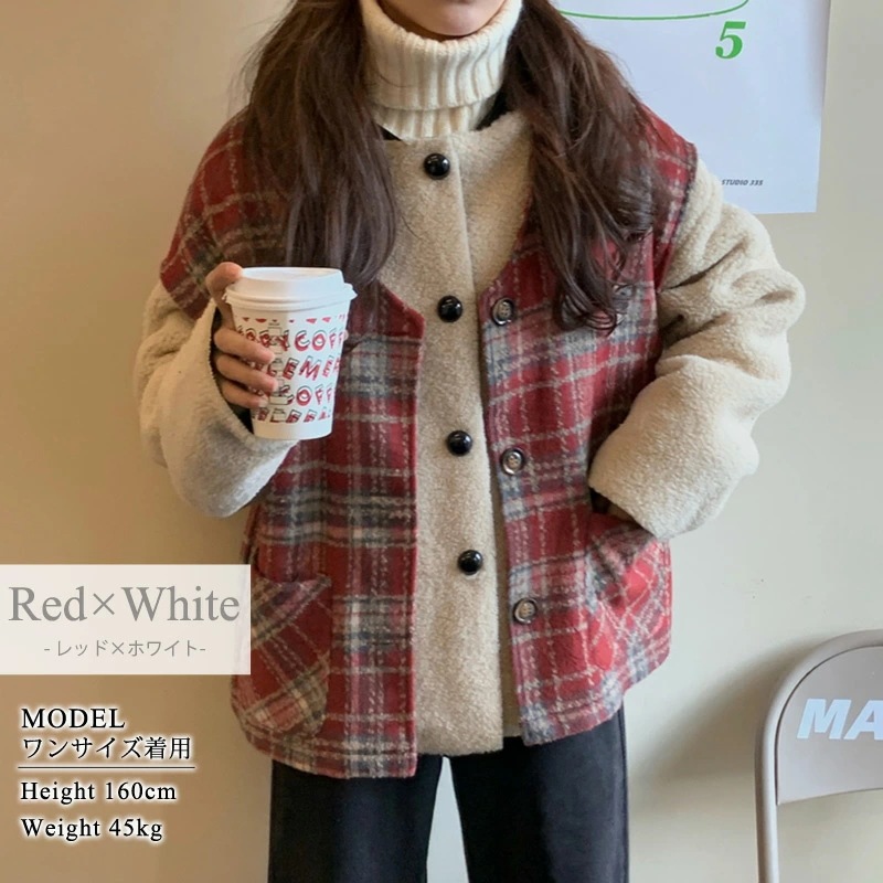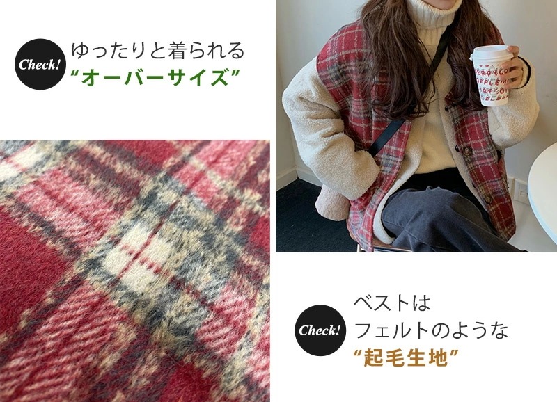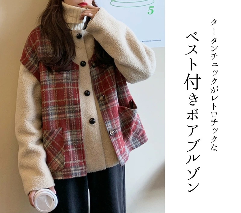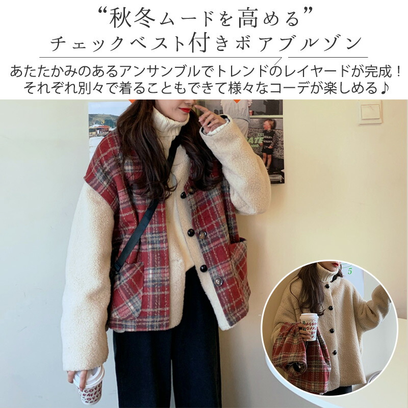 ,,ボア ブルゾン ベスト レディース アウター 秋冬 2点セット アンサンブル レイヤード 厚手 タータンチェック 無地 白 大きいサイズ オーバーサイズ ドロップショルダー ベースボールカラー ポ