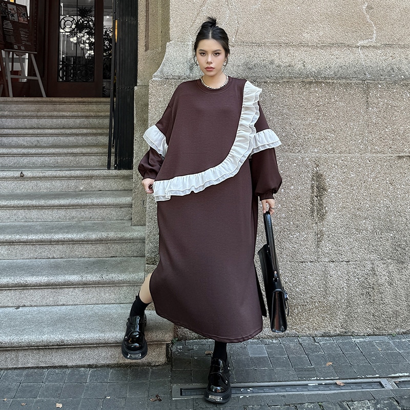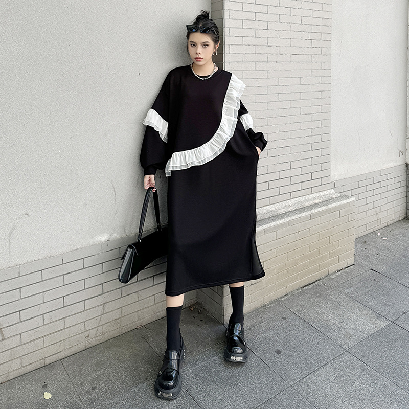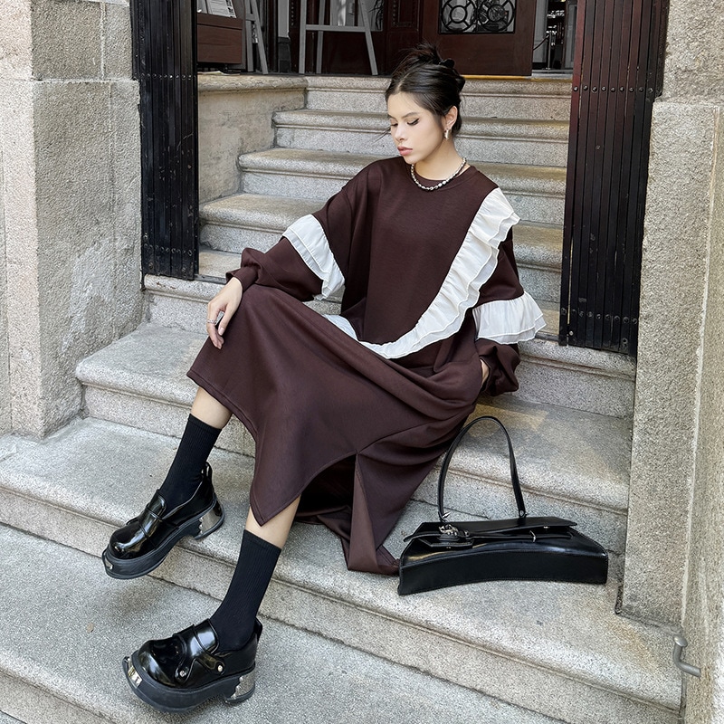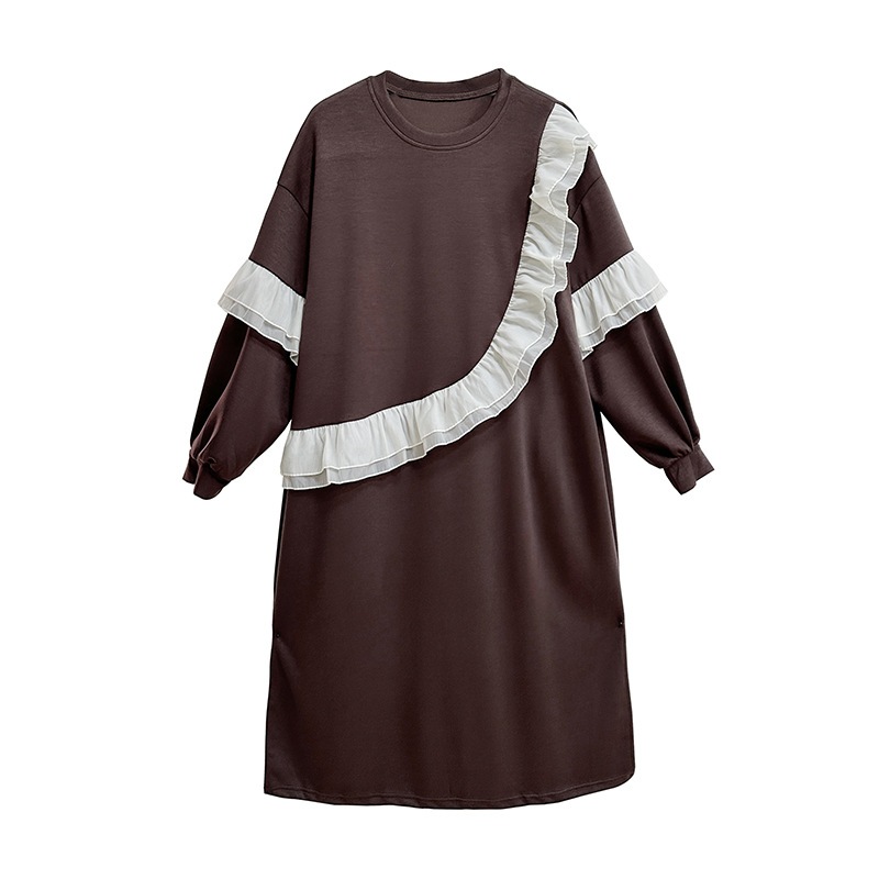 新作 レトロ ワンピース デザイン 長袖ワンピース ラッフル 切り替え ワンピース ラウンドネック ゆったり 大きいサイズ 着やせ おしゃれ ワンピース レディース パーティードレス