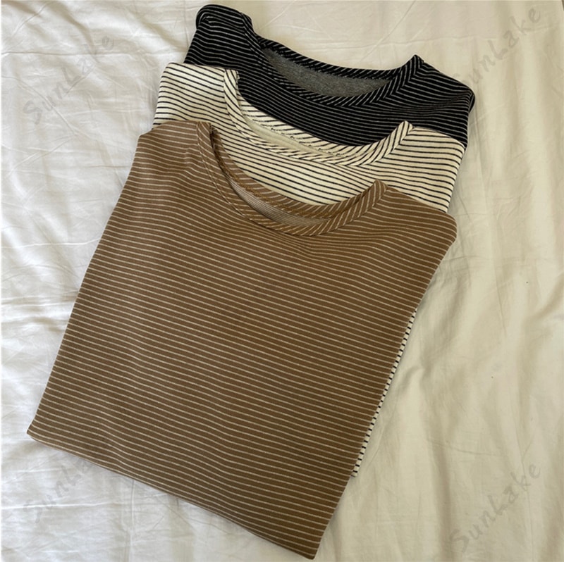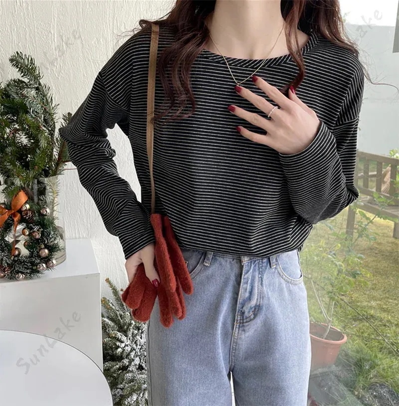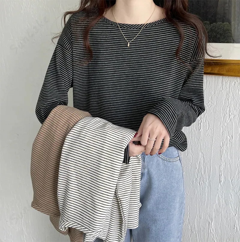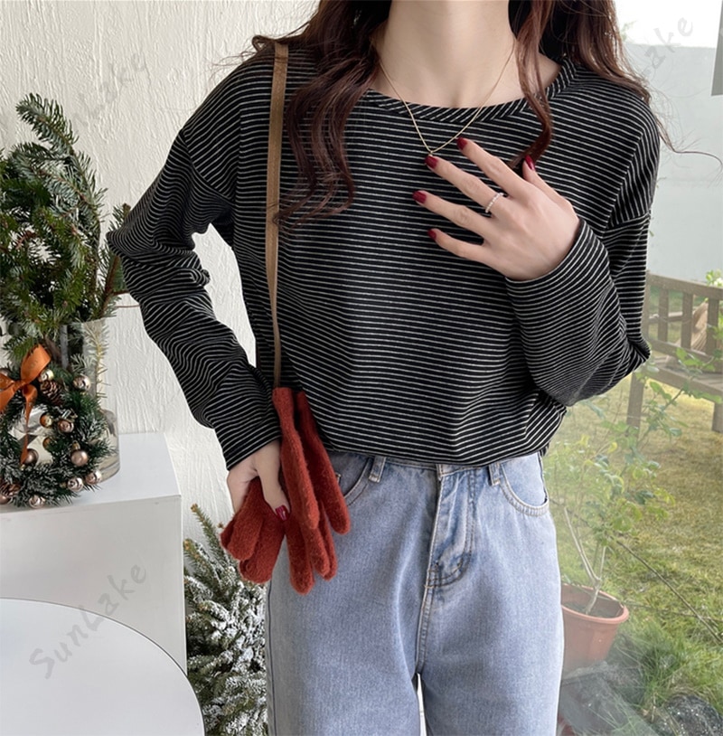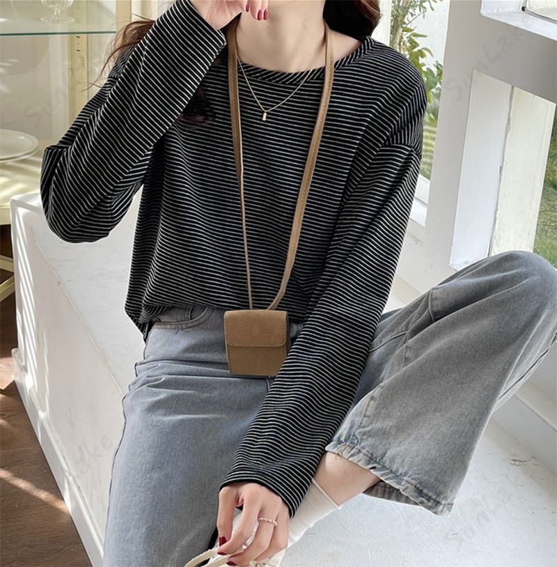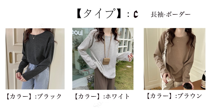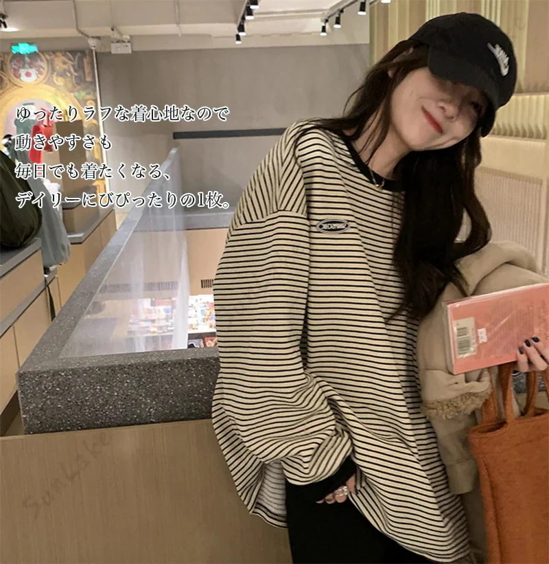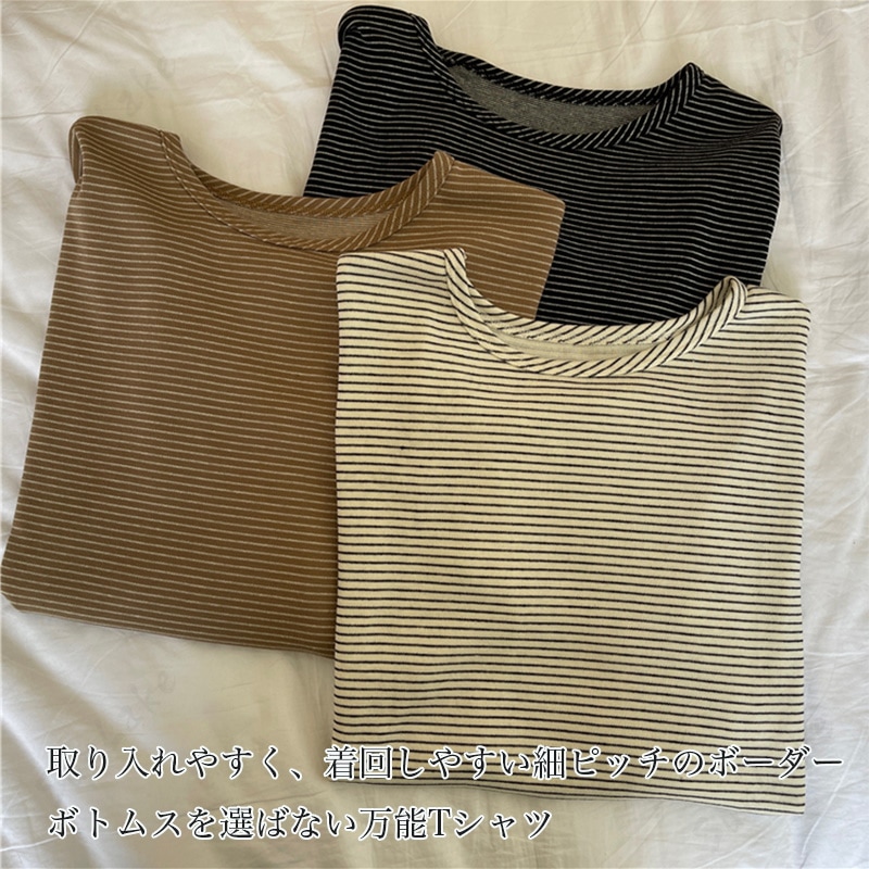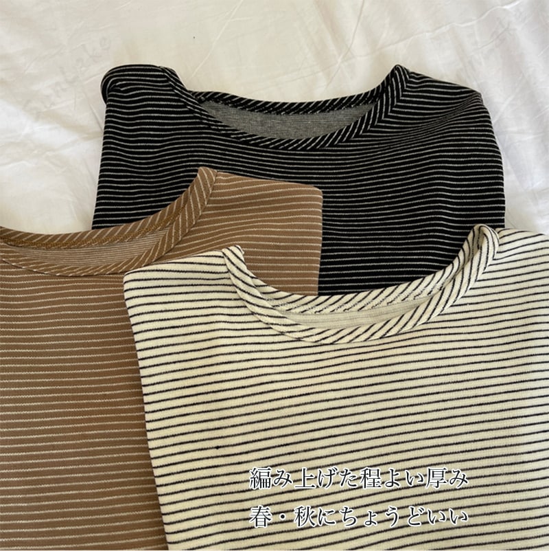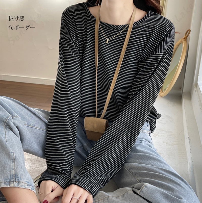 ニットタッチ万能ボーダーカットソー Tシャツトレーナースウェットトップス ストレッチドロップショルダー韓国ファッション Tシャツ カットソー