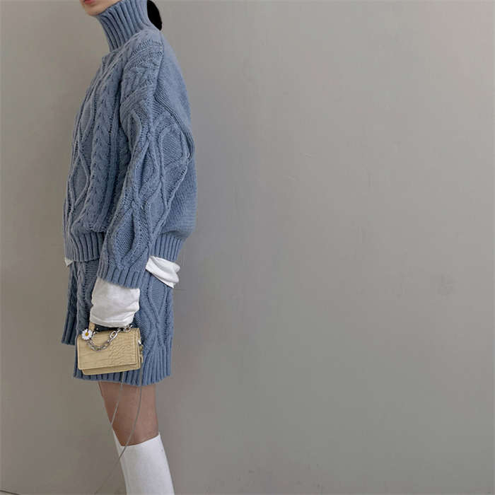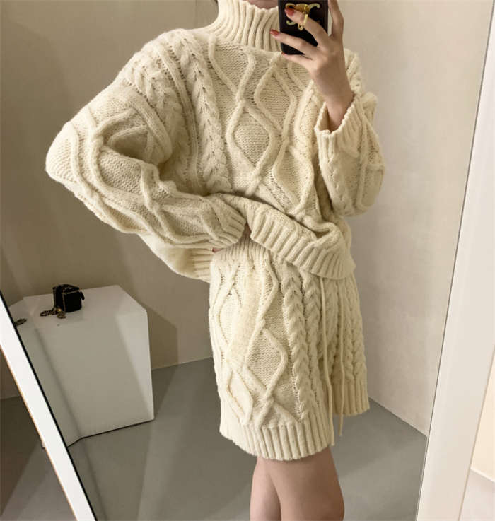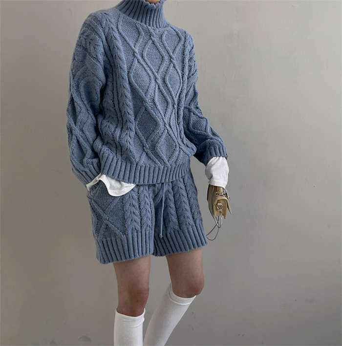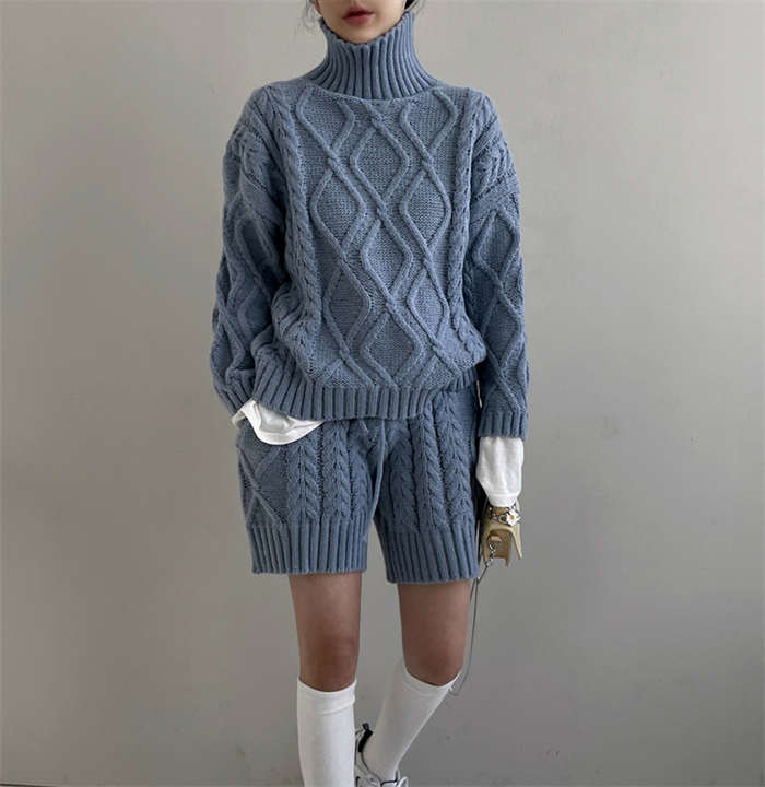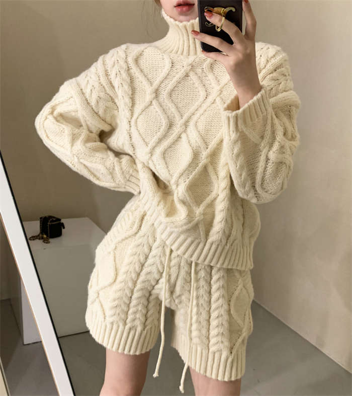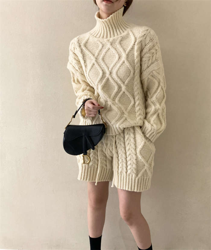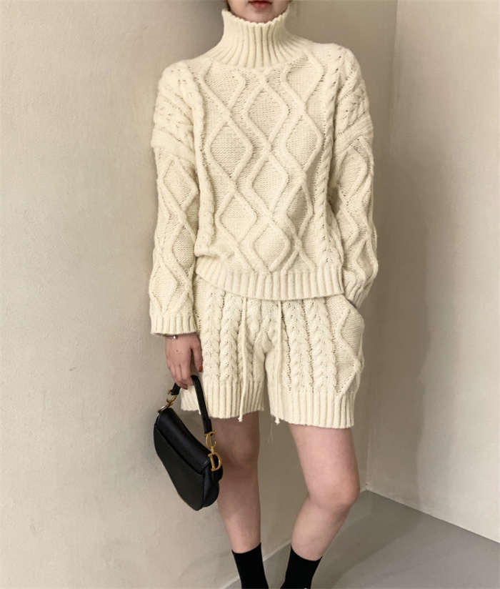 セットアップ レディース 秋冬 ニット ルームウェア ショートパンツ きれいめ 長袖 ケーブル編み 上下セット 2点セット ハイネック パンツスーツ ニットウェア 大人 お洒落 暖か 防寒 出かけ 女