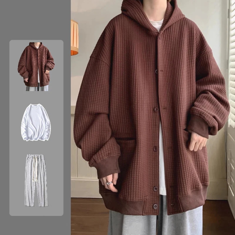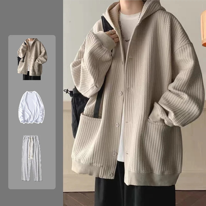 高級感 パーカー セットアップ シンプル ワッフルチェック メンズ 3点セット フード付きアウター+tシャツ+カジュアルパンツ