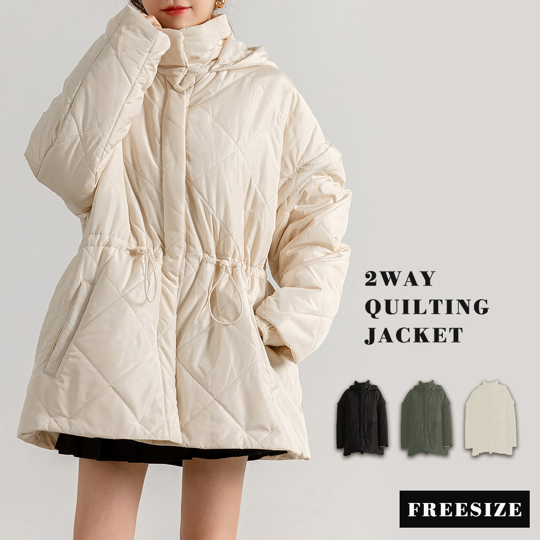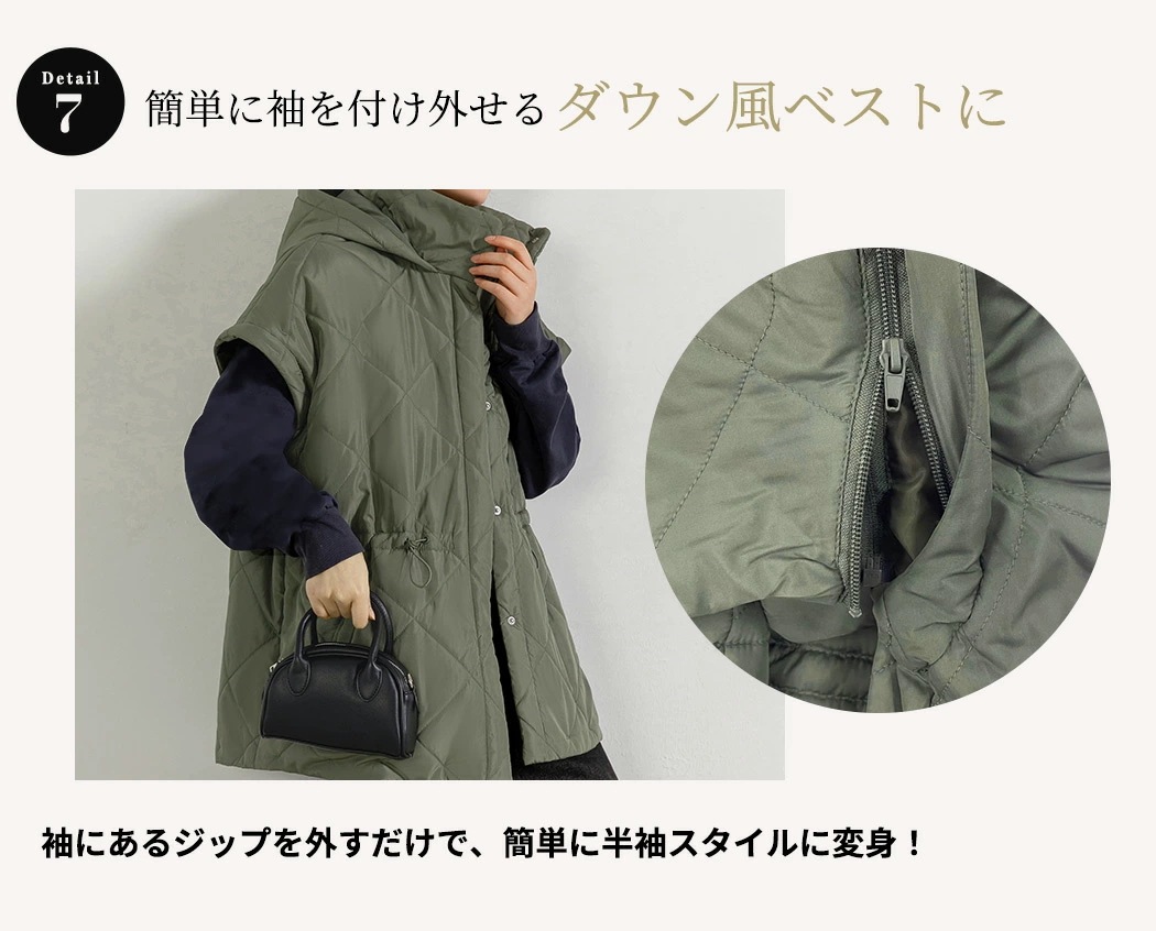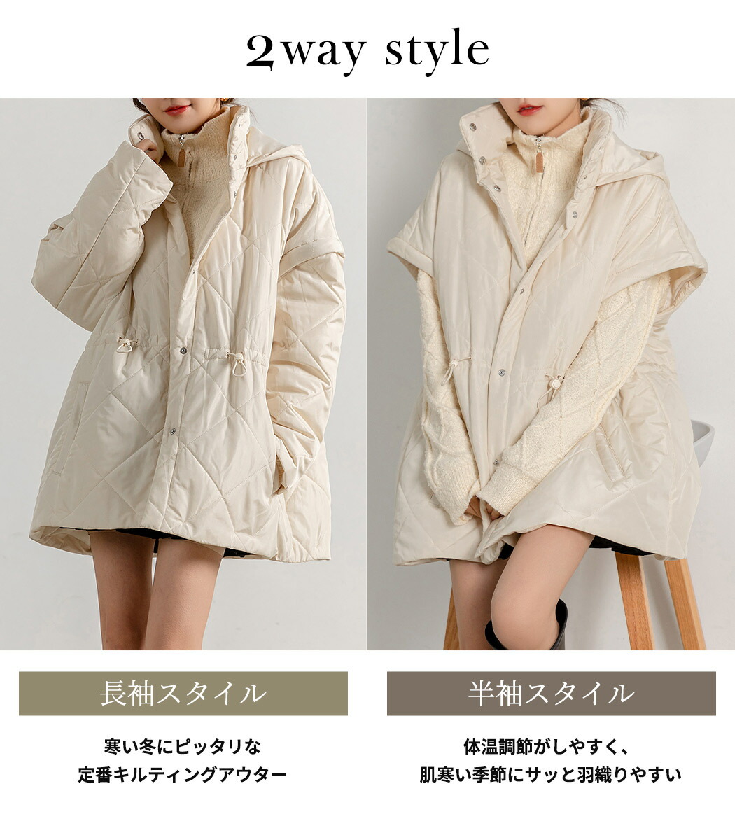 ,,キルティング ジャケット 2way 長袖 袖取り外し 半袖 ショートコート 上着 羽織り アウター レディース 防寒 暖かい ハイネック フード ポケット ドロップショ