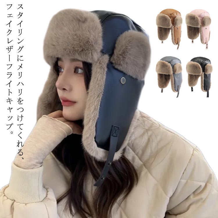 耳あて付き帽子ボア帽子耳付きフライトキャップ飛行帽レディースレザー調エコファー裏 キャップ