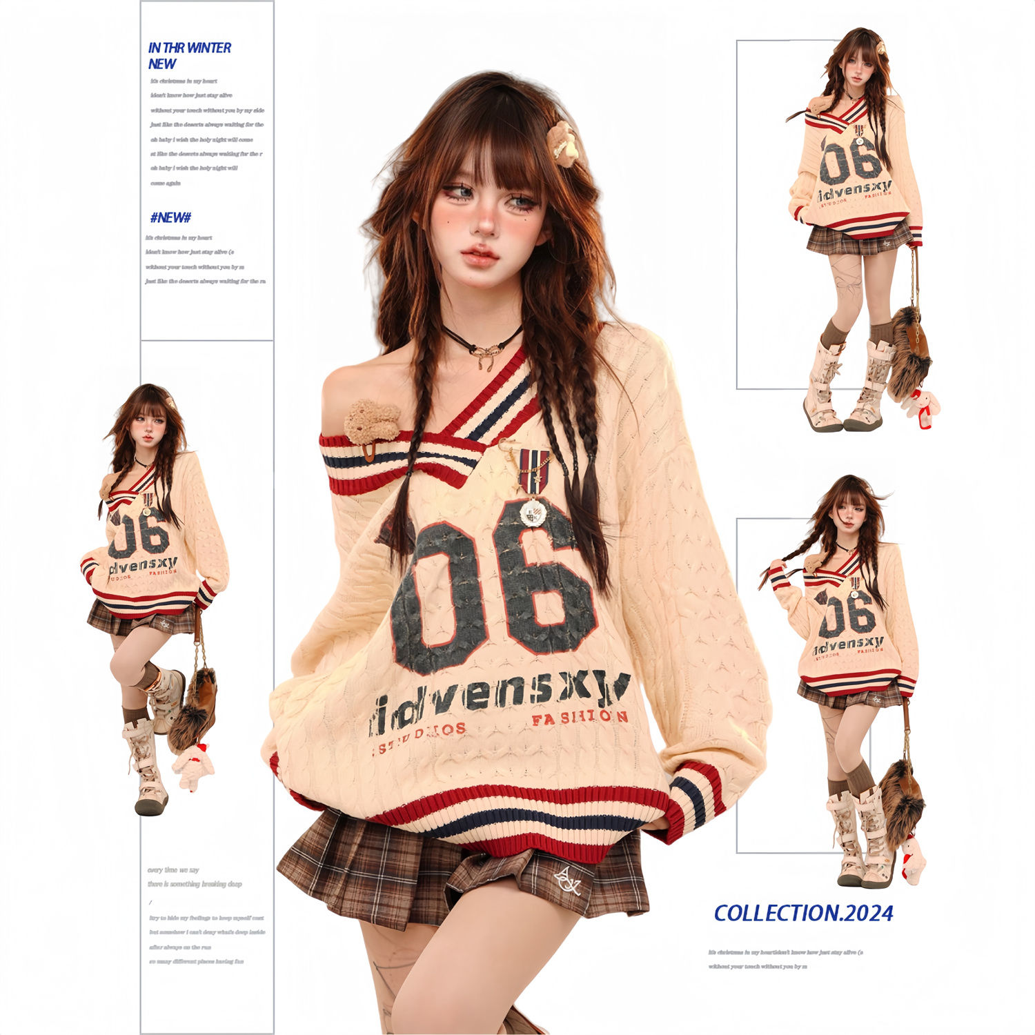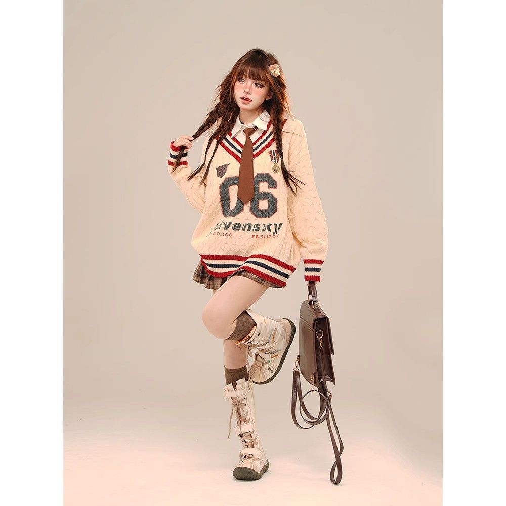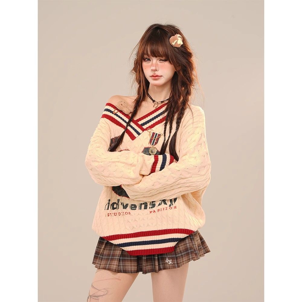 アメリカンカジュアル風のオフショルダーセーター春秋冬向けのゆったりVネックケーブルニットトップス ギャル系ファッション ニット