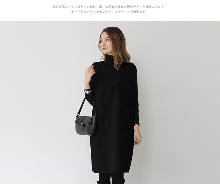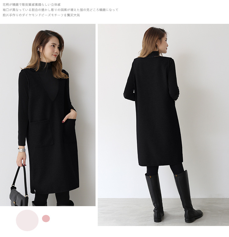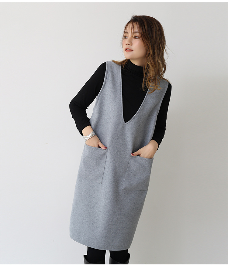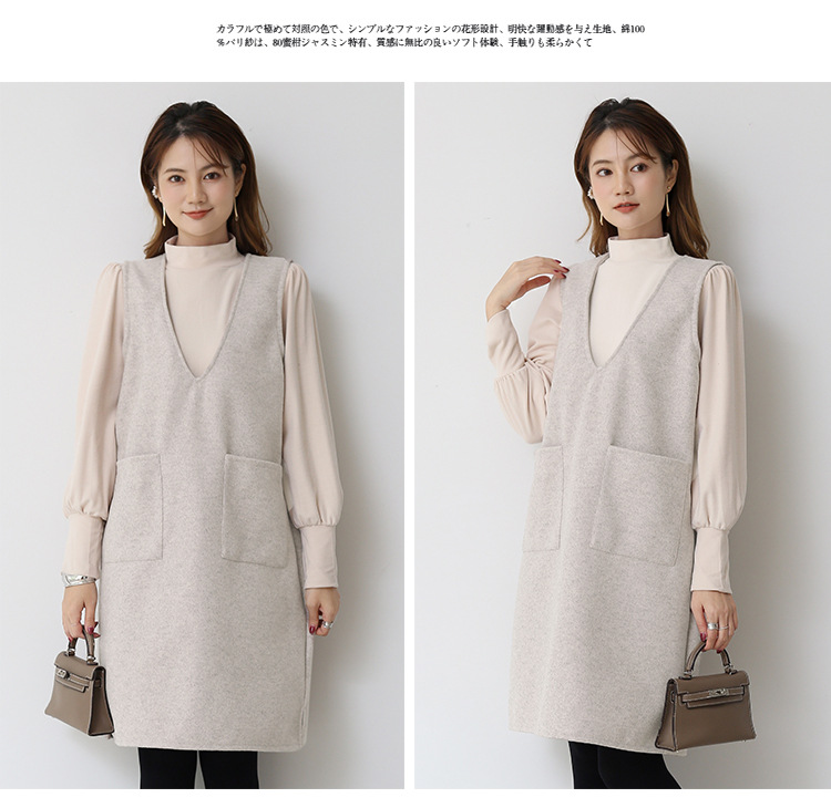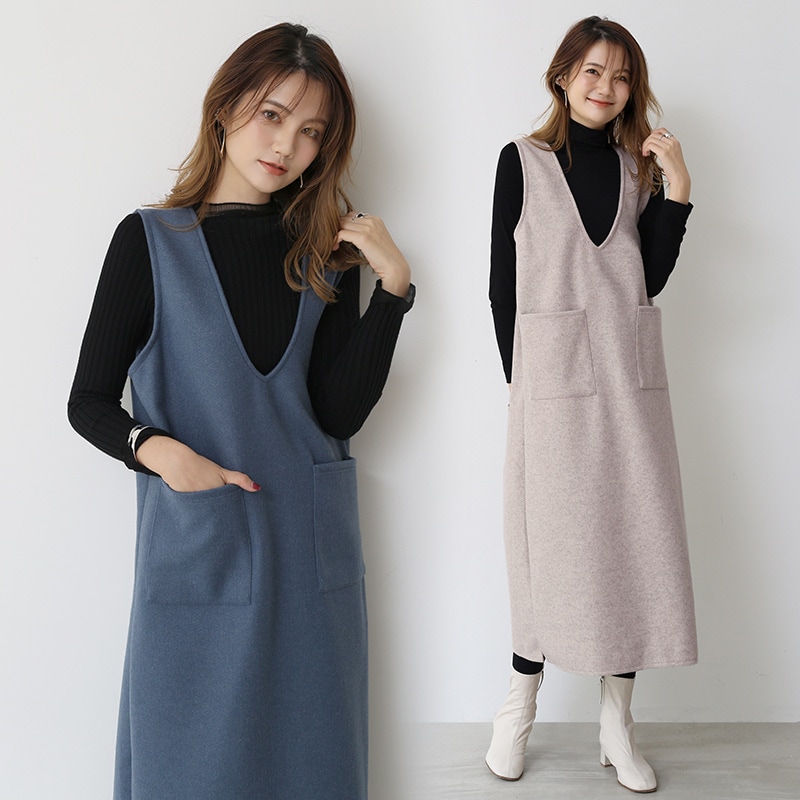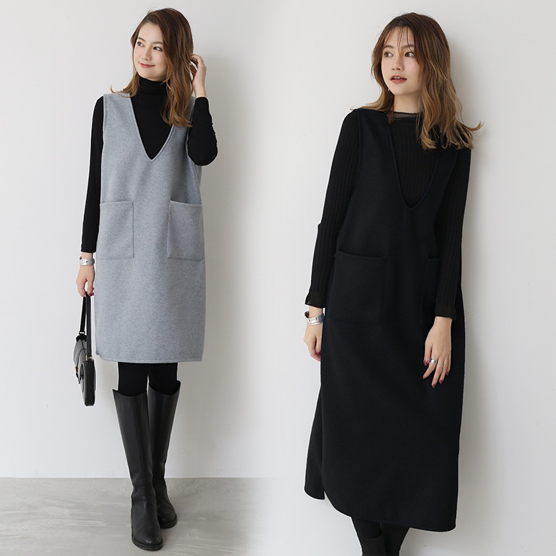 秋冬 Vラインワンピース ジャンパースカート ワンピース レディース ロングワンピース ロング丈 ノースリーブ ワンピ ロング ラウンドネック無地 ゆったり 体型カバー 綿麻調 可愛い