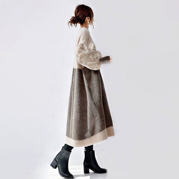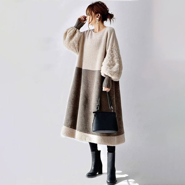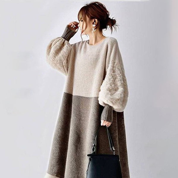 レディース ワンピース パフスリーブ 丸襟 長袖セーターワンピース 新作 秋冬 韓国風 通勤 オシャレ 長袖ロング マキシ丈ワンピ