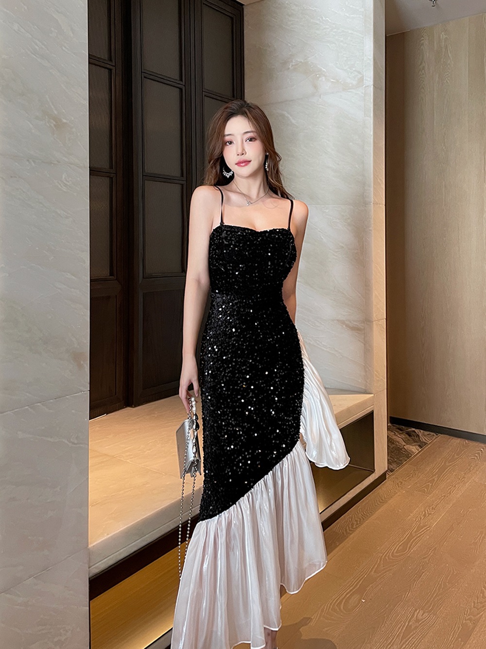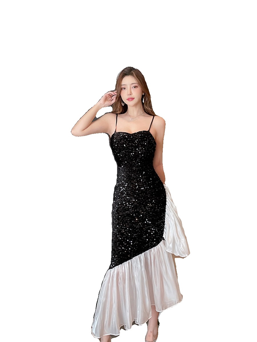 フレンチエレガントレディのスパンコールドレススリムフィットお尻カバーブサスペンダードレス秋 ドレス