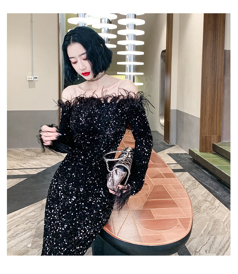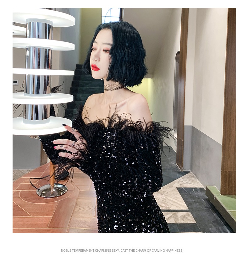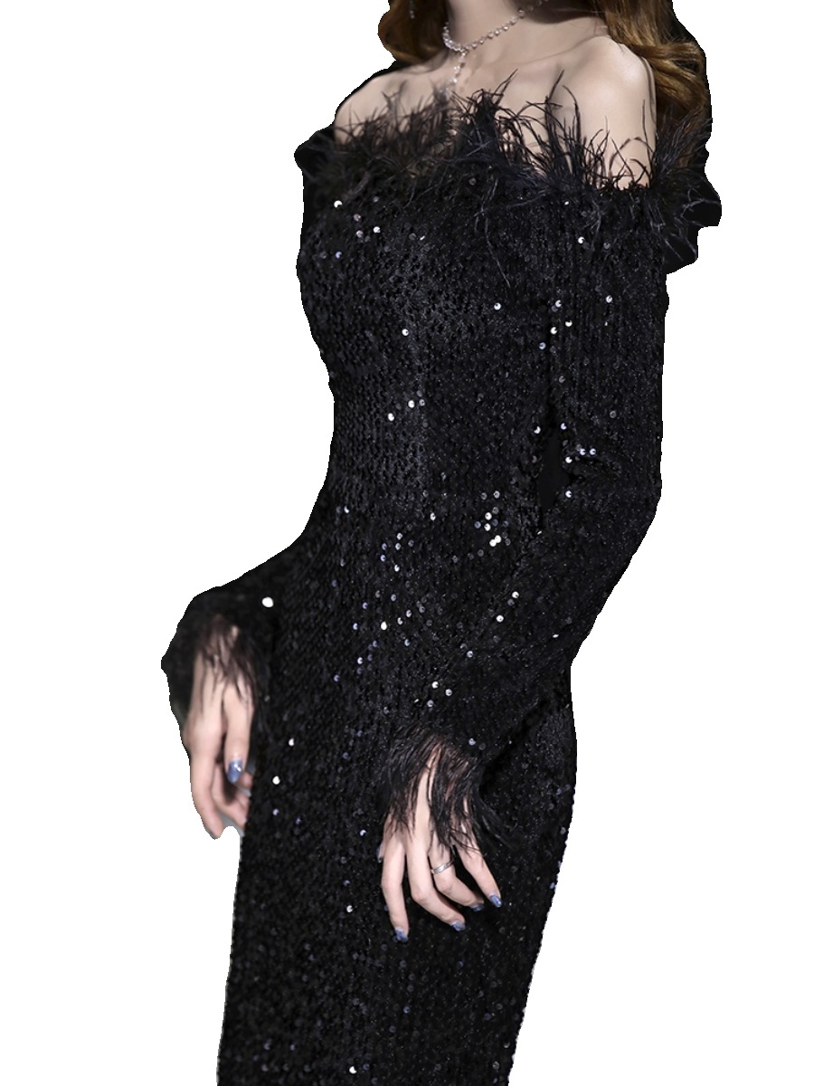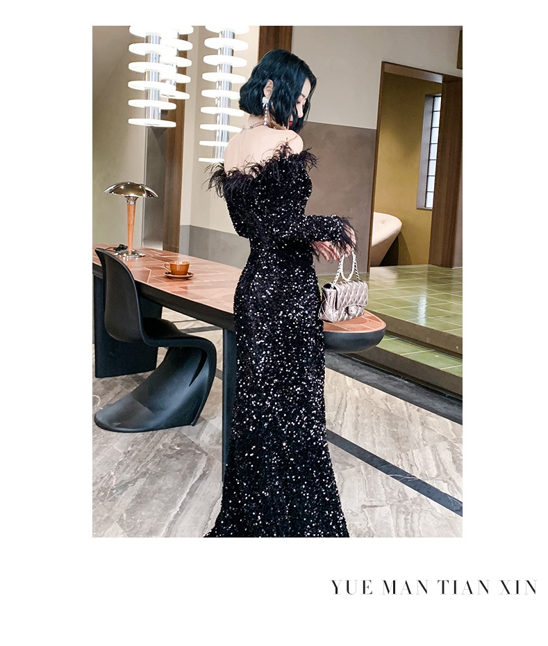 ドレスバンケットスタイルワンショルダードレスブラックスパンコールテールホストシニア ドレス
