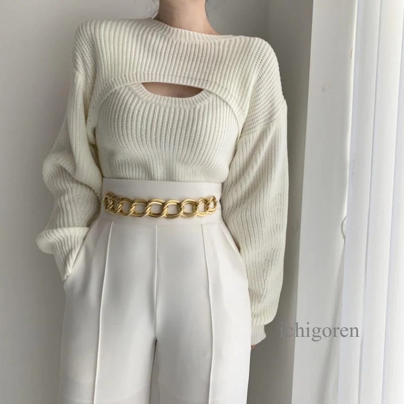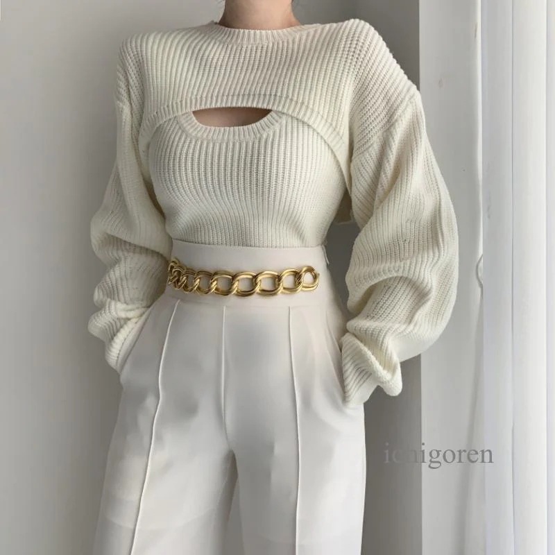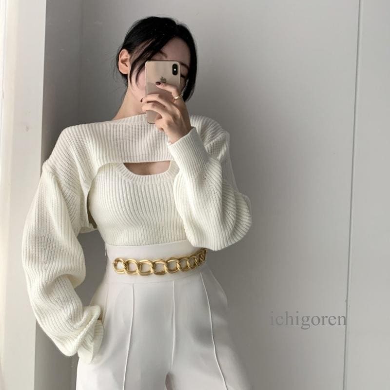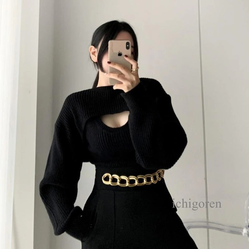 韓国ファッショ短丈ニット タンク アンサンブル レディース ショート丈 セーター 白 黒 ニット トップス 秋 冬 おしゃれ ニット