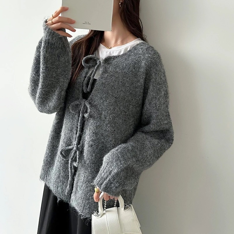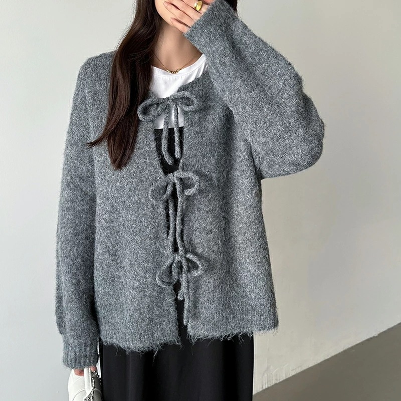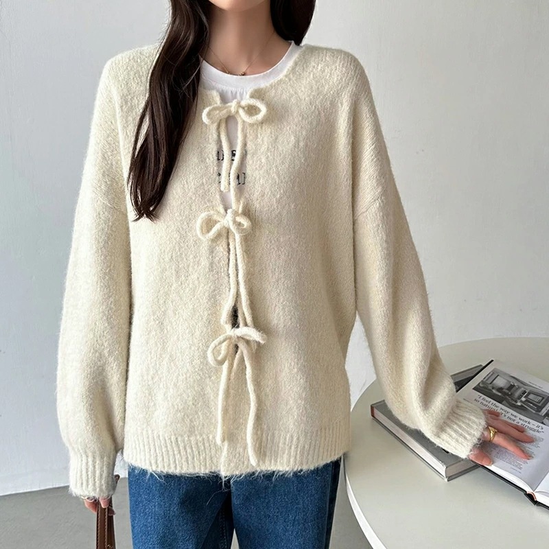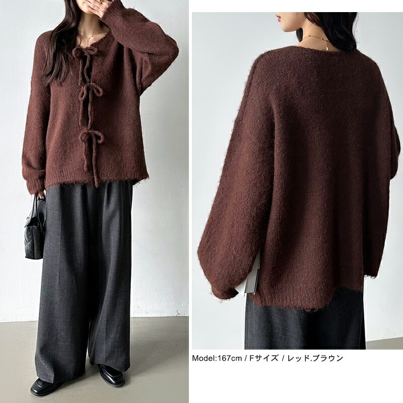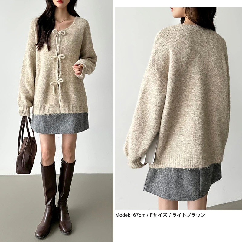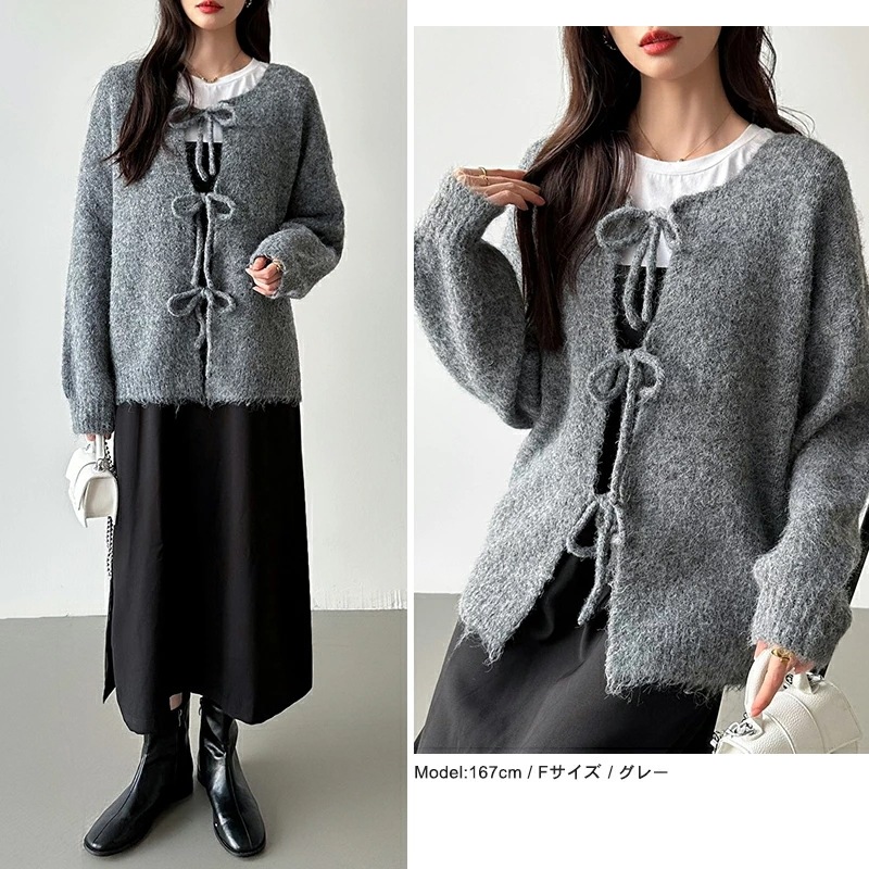 前後2way リボンカーディガン ニットカーディガン カーディガン リボン ニット レディース ドロップショルダー ラウンドネック トップス 長袖 ボレロ