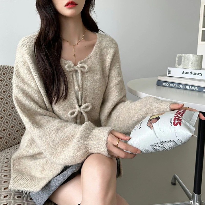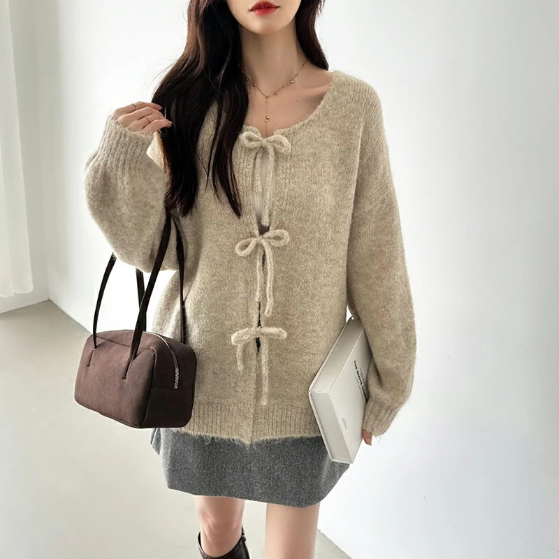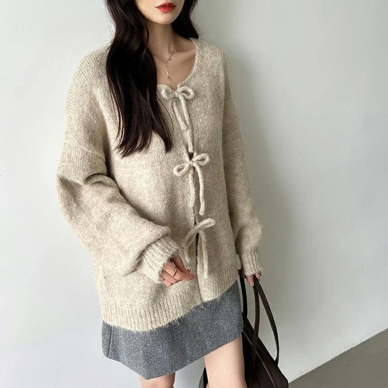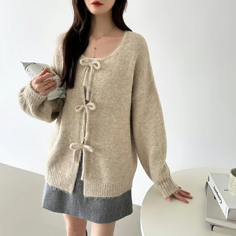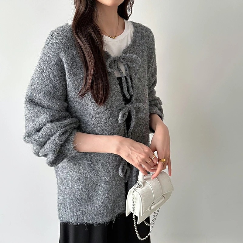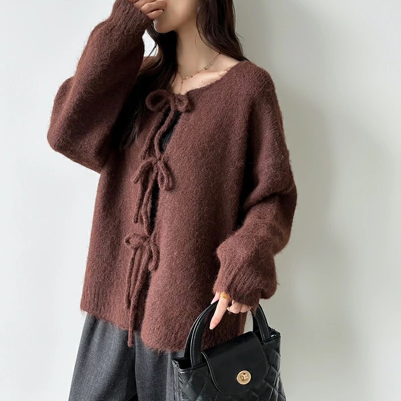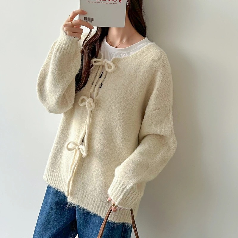 前後2way リボンカーディガン ニットカーディガン カーディガン リボン ニット レディース ドロップショルダー ラウンドネック トップス 長袖 ボレロ