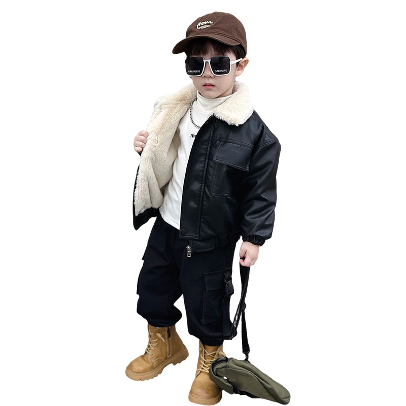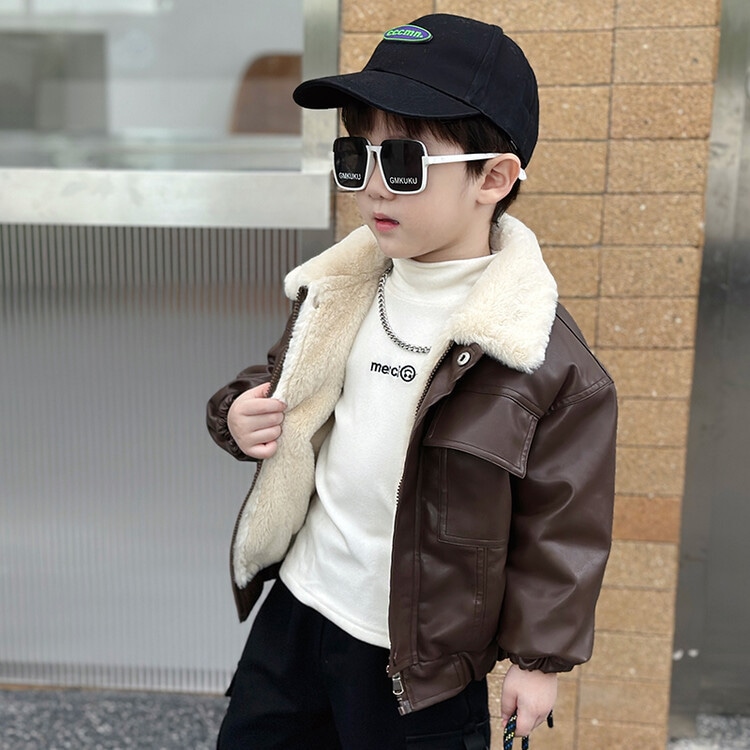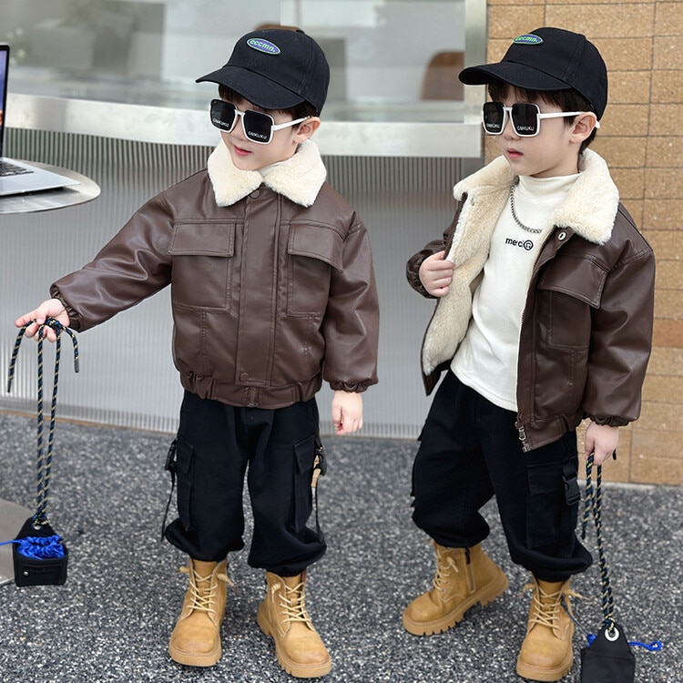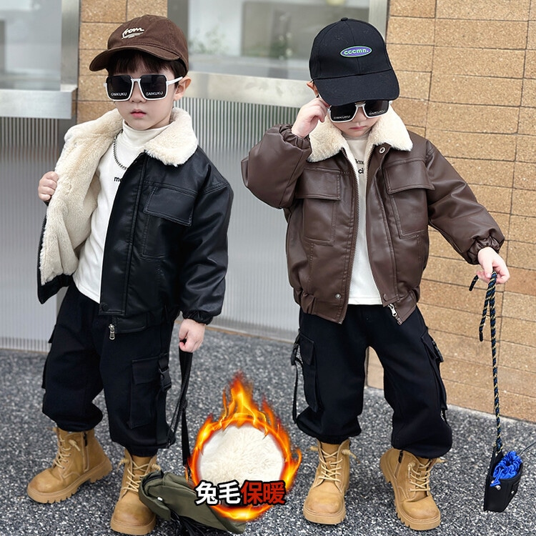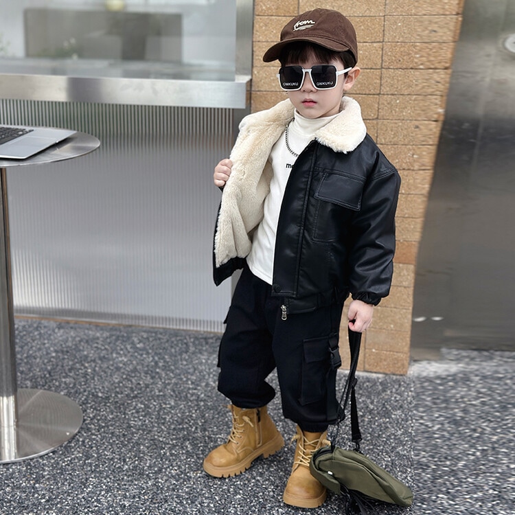 子拱服 アウター カーディガン男の子のジャケットは革のジャケット冬の子供ウサギの毛皮のベルベットの厚くされたバイカーの服小さな子供の暖かい防風コートの潮を厚くした