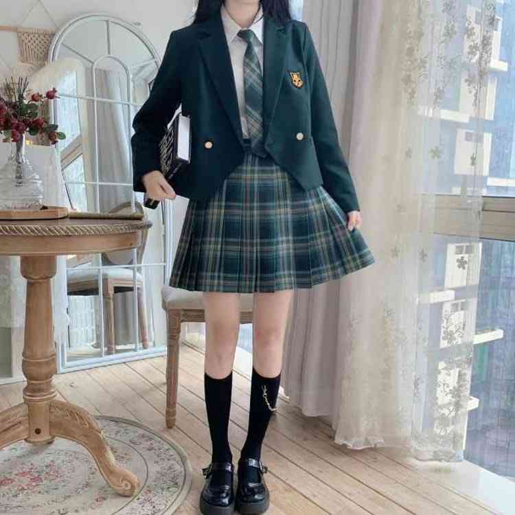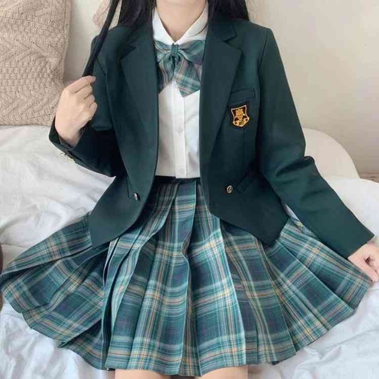 ブレザー制服 女子用 ブレザー+長袖ブラウス+バッジ+チェック柄プリーツスカート+リボン 女の子 フォーマルセット ドレス
