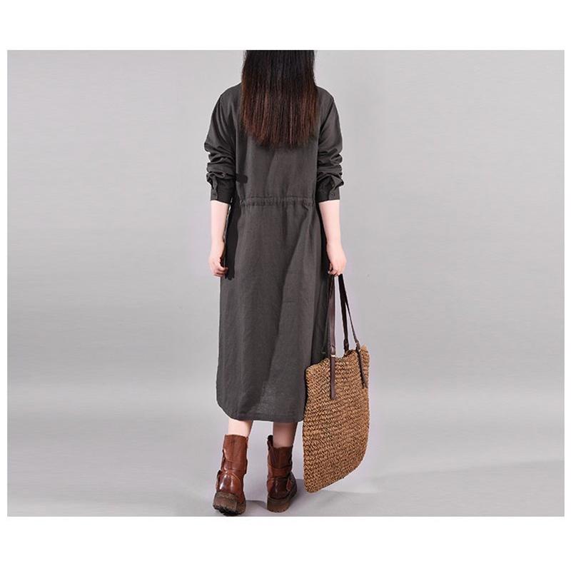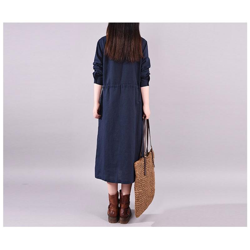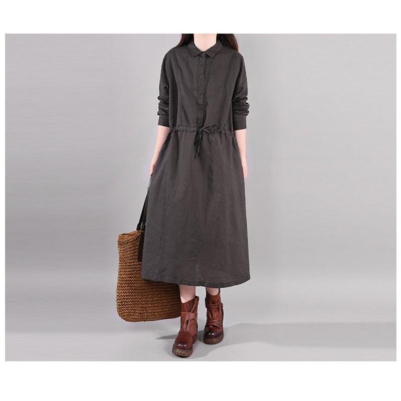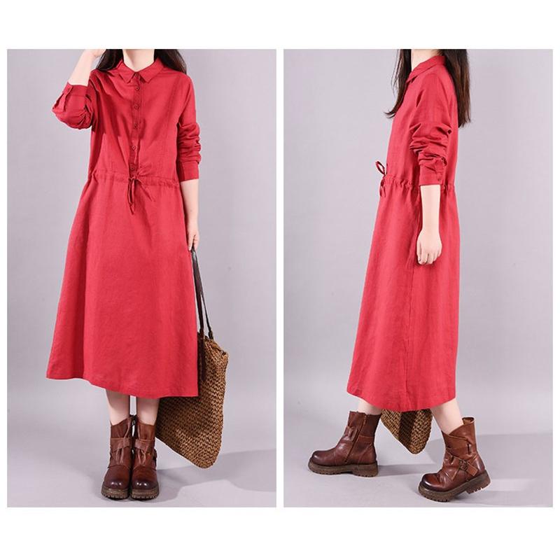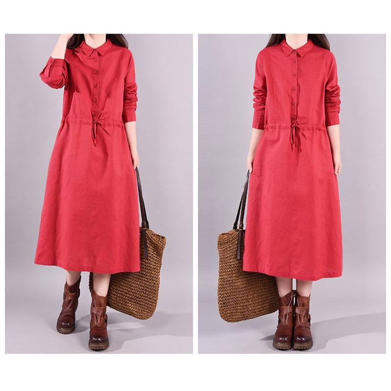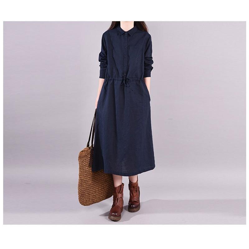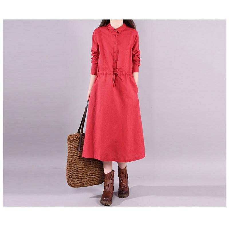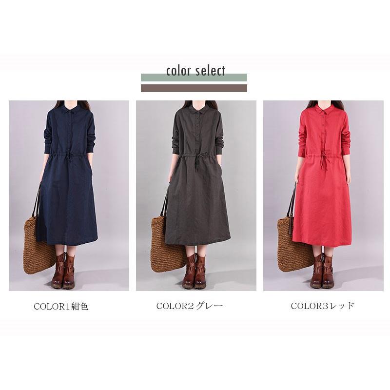 ワンピース ロングワンピース レディース 長袖 襟付き ウエストリボン 折り襟 綿混 コットン混 ゆったり 大きいサイズ 無地 着痩せ カジュアル風 春 秋 30代