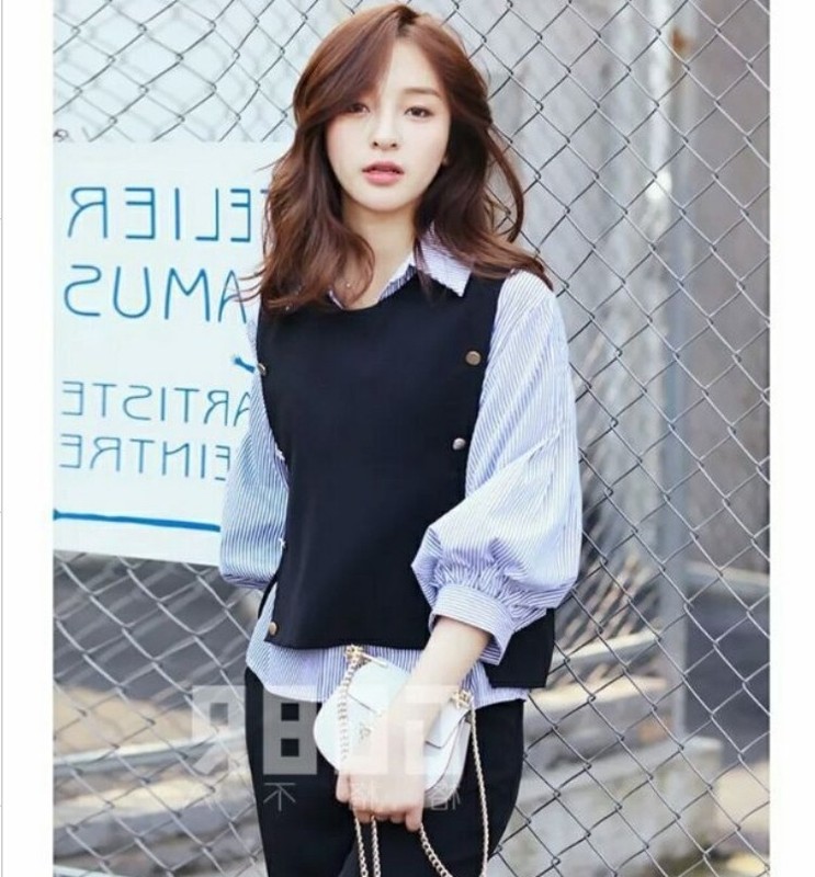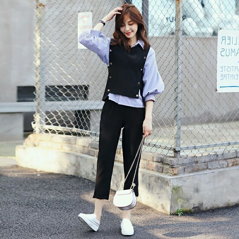 セットアップ セットアップ 韓国ファッション 三点セット 上下セット ニットタンクトップ 長袖 ストライプシャツ ストレート 弾力 おしゃれ