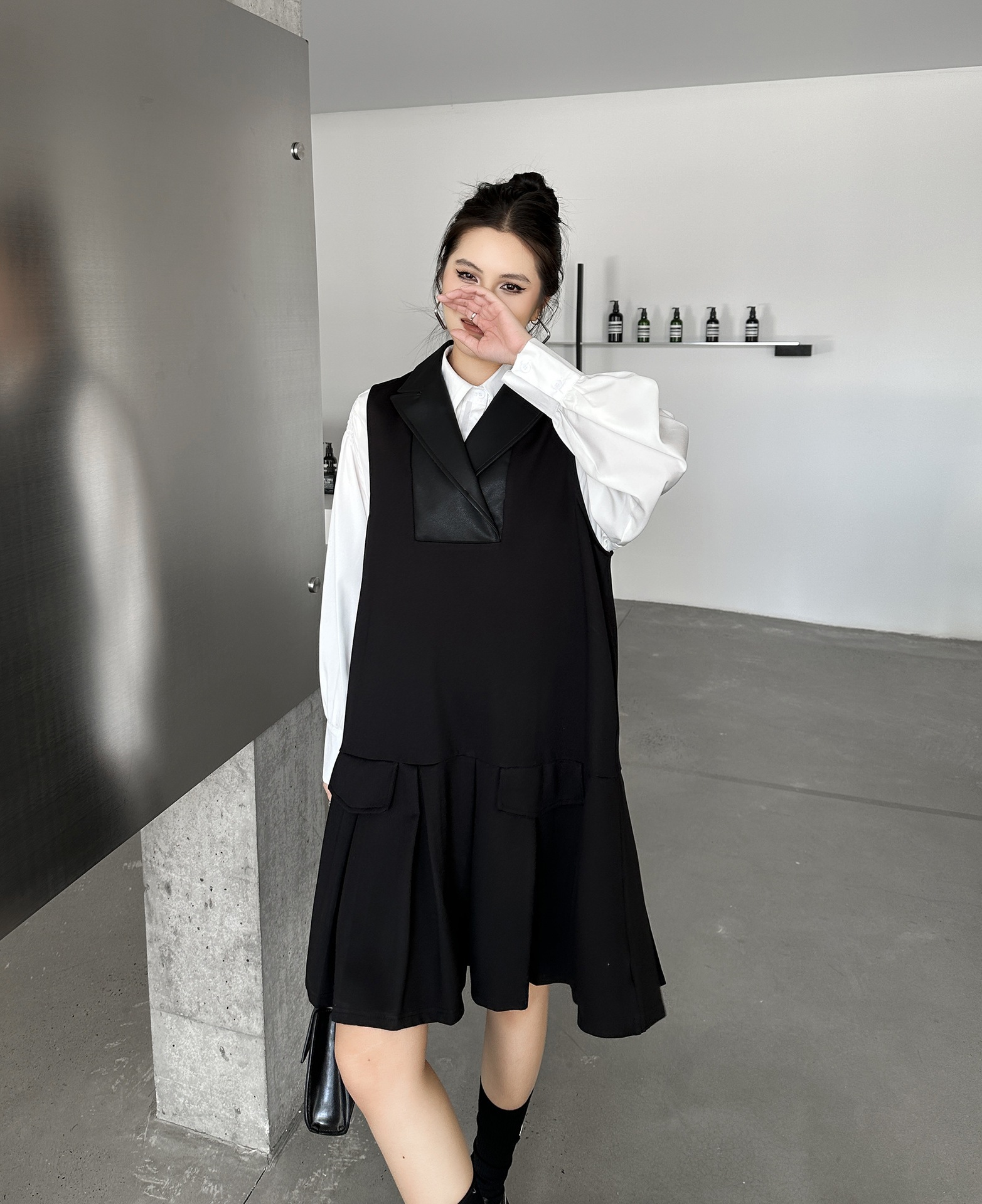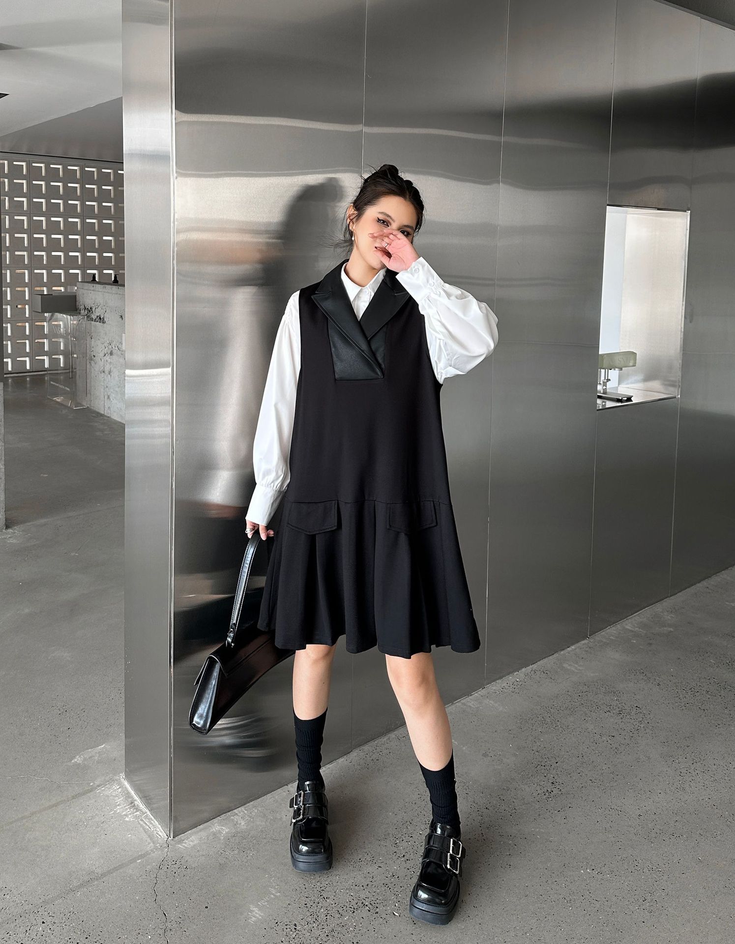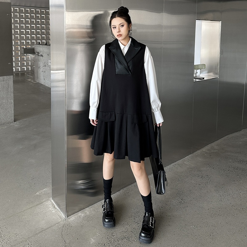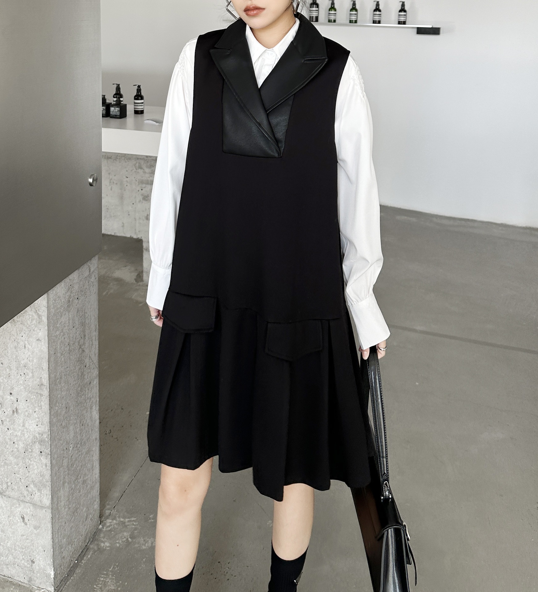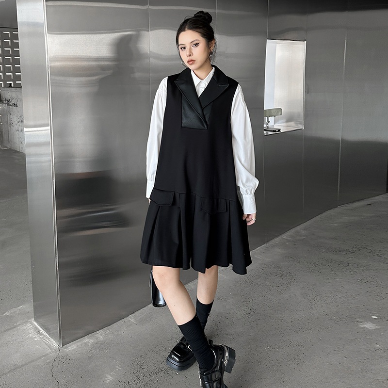2025春 ミドル丈 ワンピース PUレザードッキング おしゃれ レディース 関連商品購入可能 メガ割 袖なしミニ 膝丈ワンピ