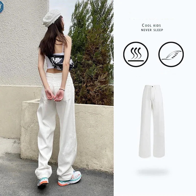ホワイト ワイドパンツ デニムパンツ レディース 春 新商品 ハイウェスト 着 痩せ ゆったり エクストラログ丈 ストレートパンツ モップパンツ
