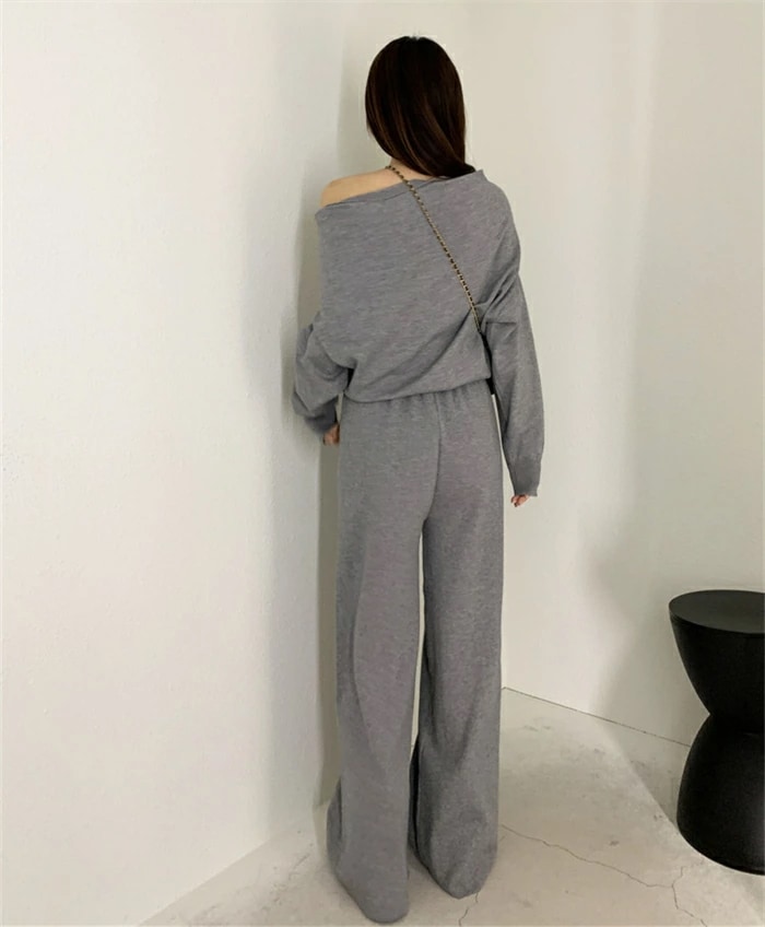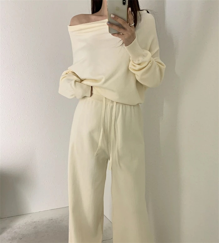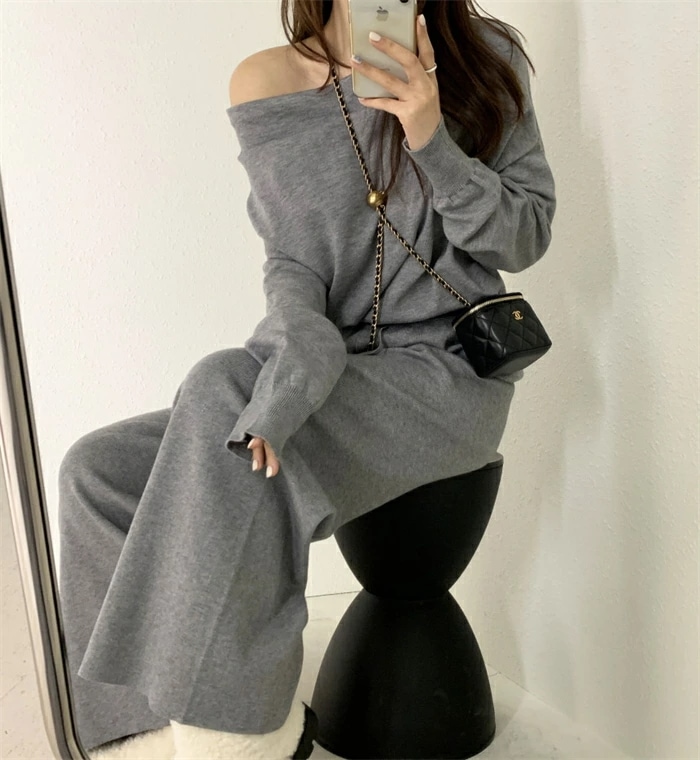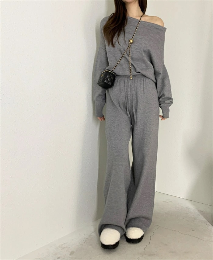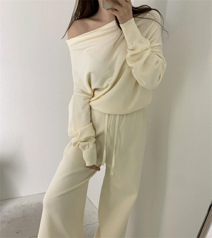 セットアップ トップス パンツ レディース 秋 冬 長袖 ニット セーター ニットパンツ セーター ロングパンツ 上下2点セット オフショルダー 無地 カジュアル セクシー リラックス 春秋 柔らかい