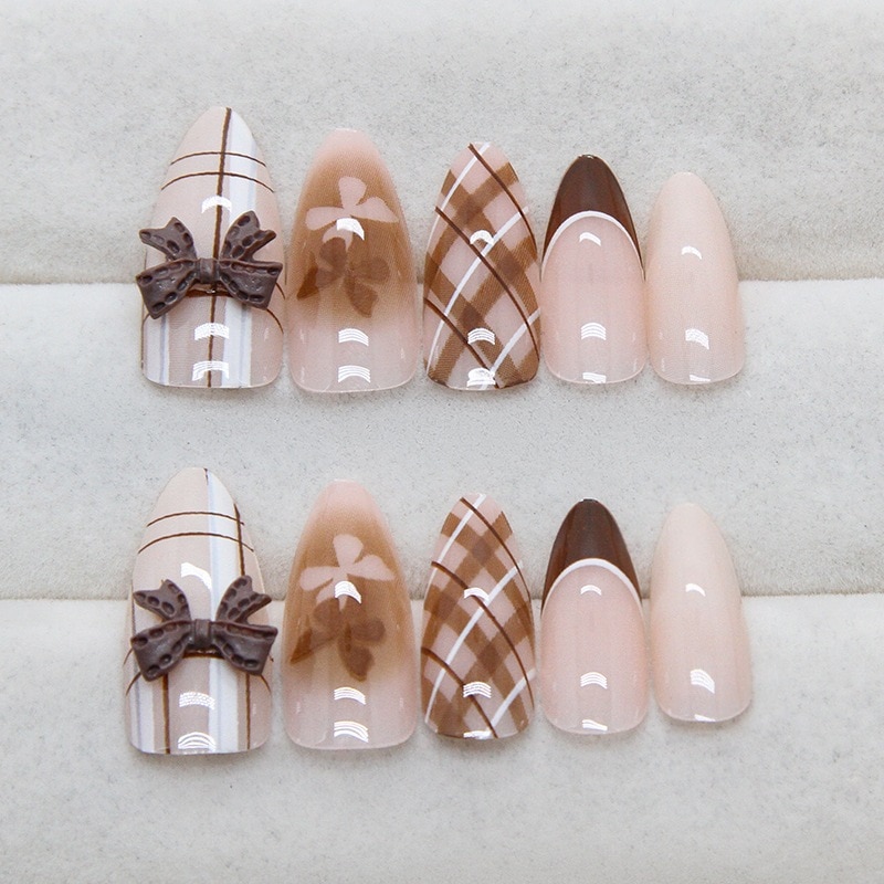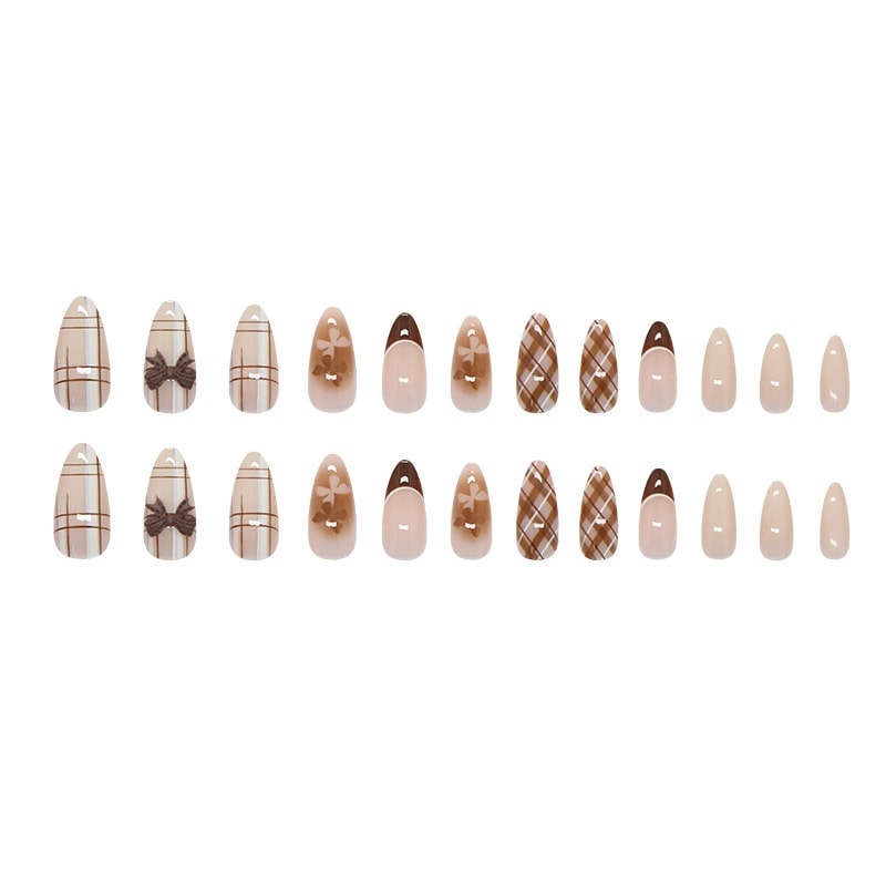ネイルパーツ ブラウンチェックのフレンチリボン秋冬のおしゃれな雰囲気着甲取り外し可能なネイルチップ着甲24枚 ネイルチップ