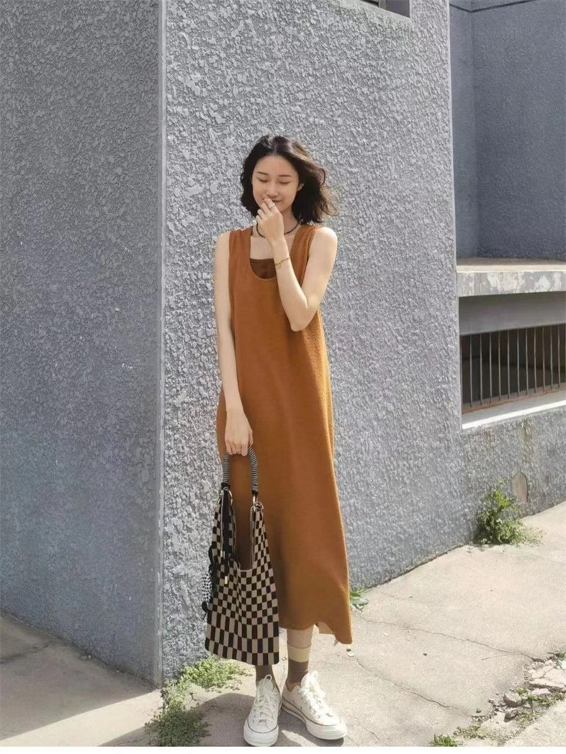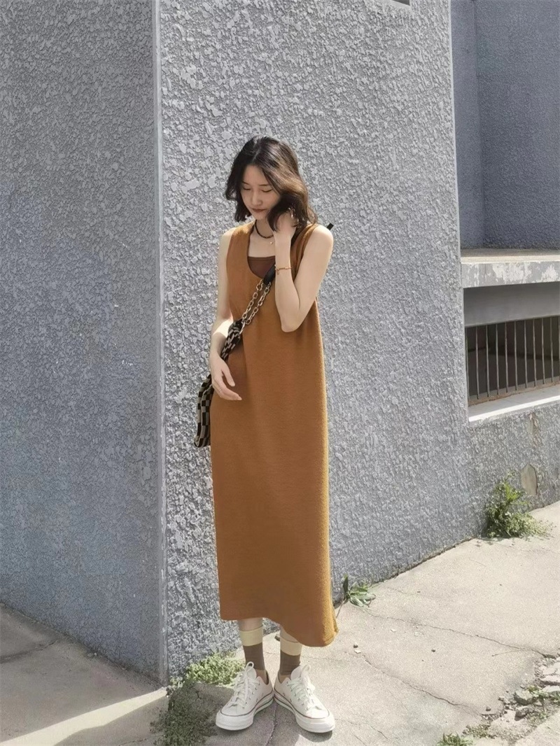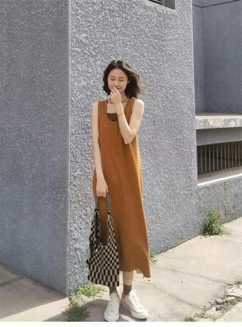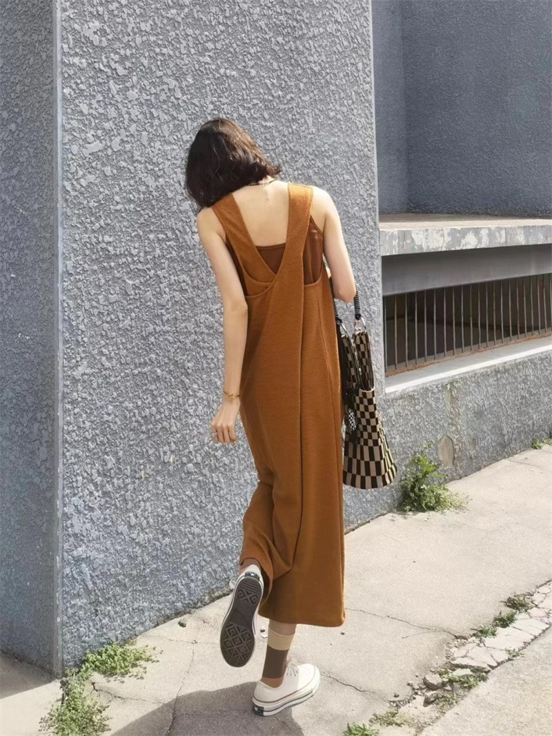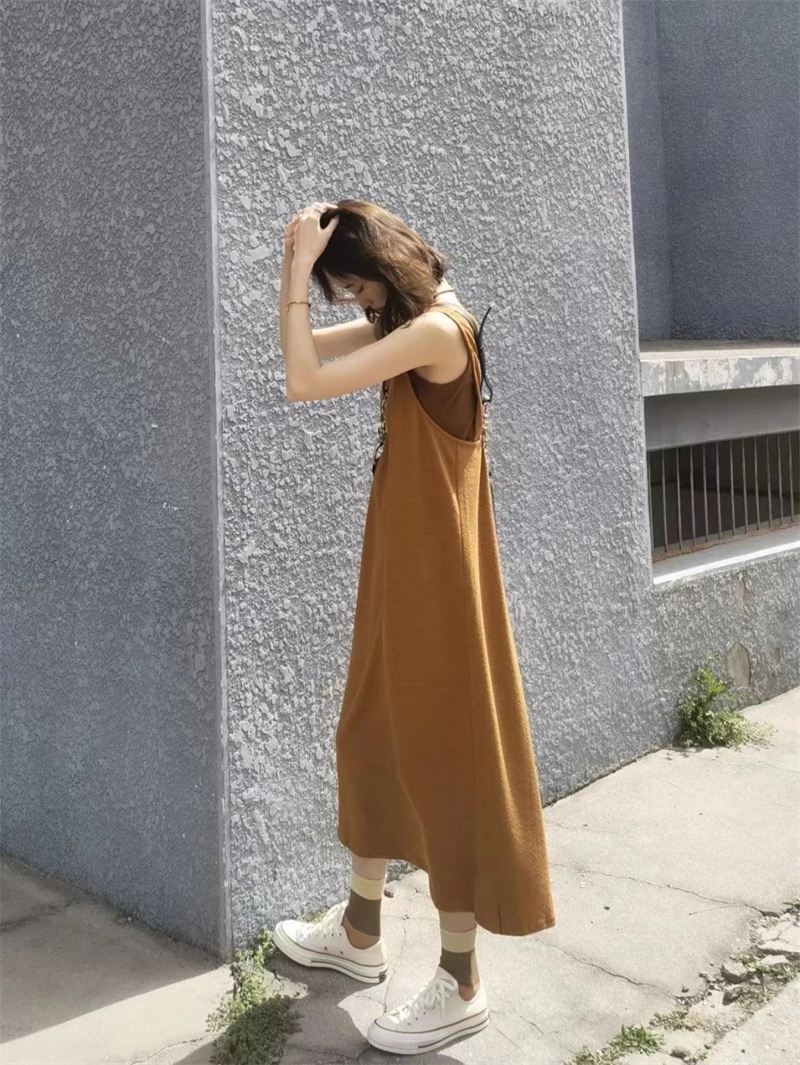 ヘビロテ キャミワンピース 韓国ファッション ヴィンテージホルタードレス 夏 ミディ ゆったり ベスト ロングドレス キャミワンピ