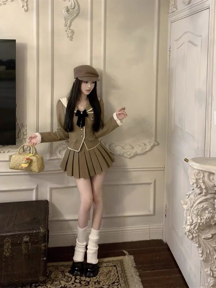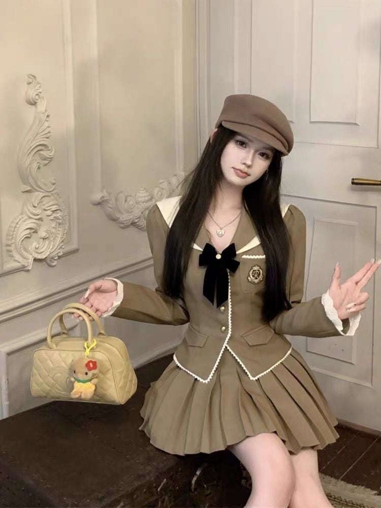 セットアップ 韓国ファッション 涼しく楽ちんセット2024 新作 学院風スーツリボンスカート雰囲気ブレザー春秋プリーツスカート2枚セット 制服 ファッションアップ レディース